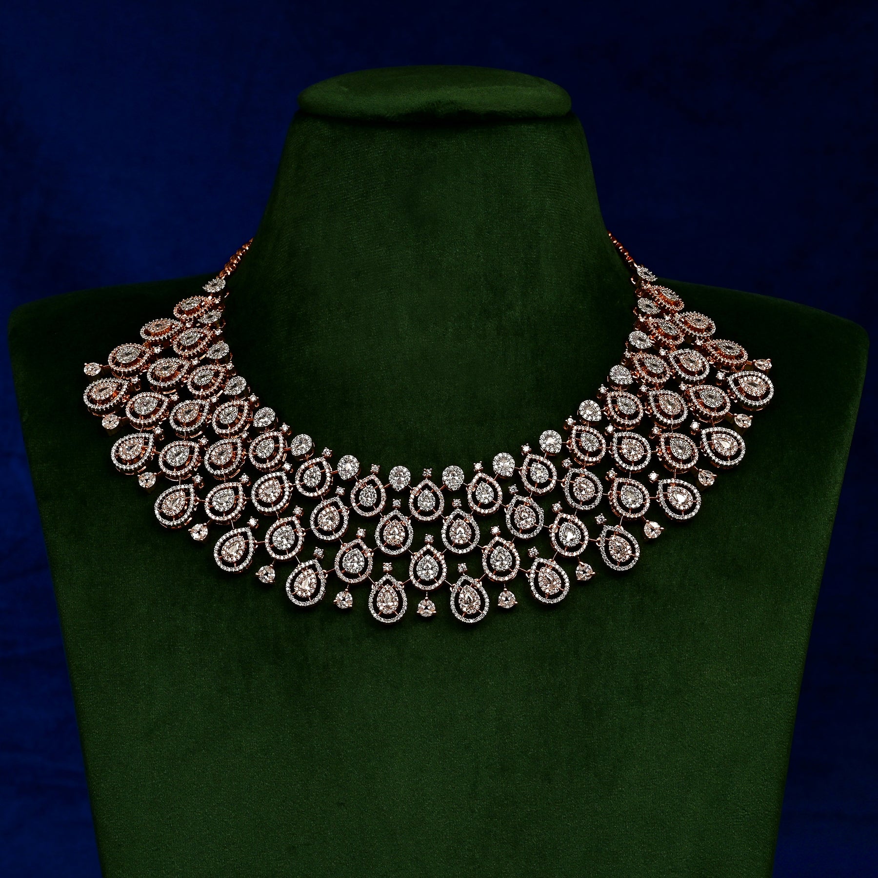 Exquisitely hand-crafted CZ necklace set featuring premium cubic zirconia stones that brilliantly mimic diamonds. Set in a sophisticated rose gold finish, this exclusive design offers unparalleled elegance. Each piece is meticulously created to ensure exceptional quality and distinctive character, making it a remarkable addition to fine jewelry collections.