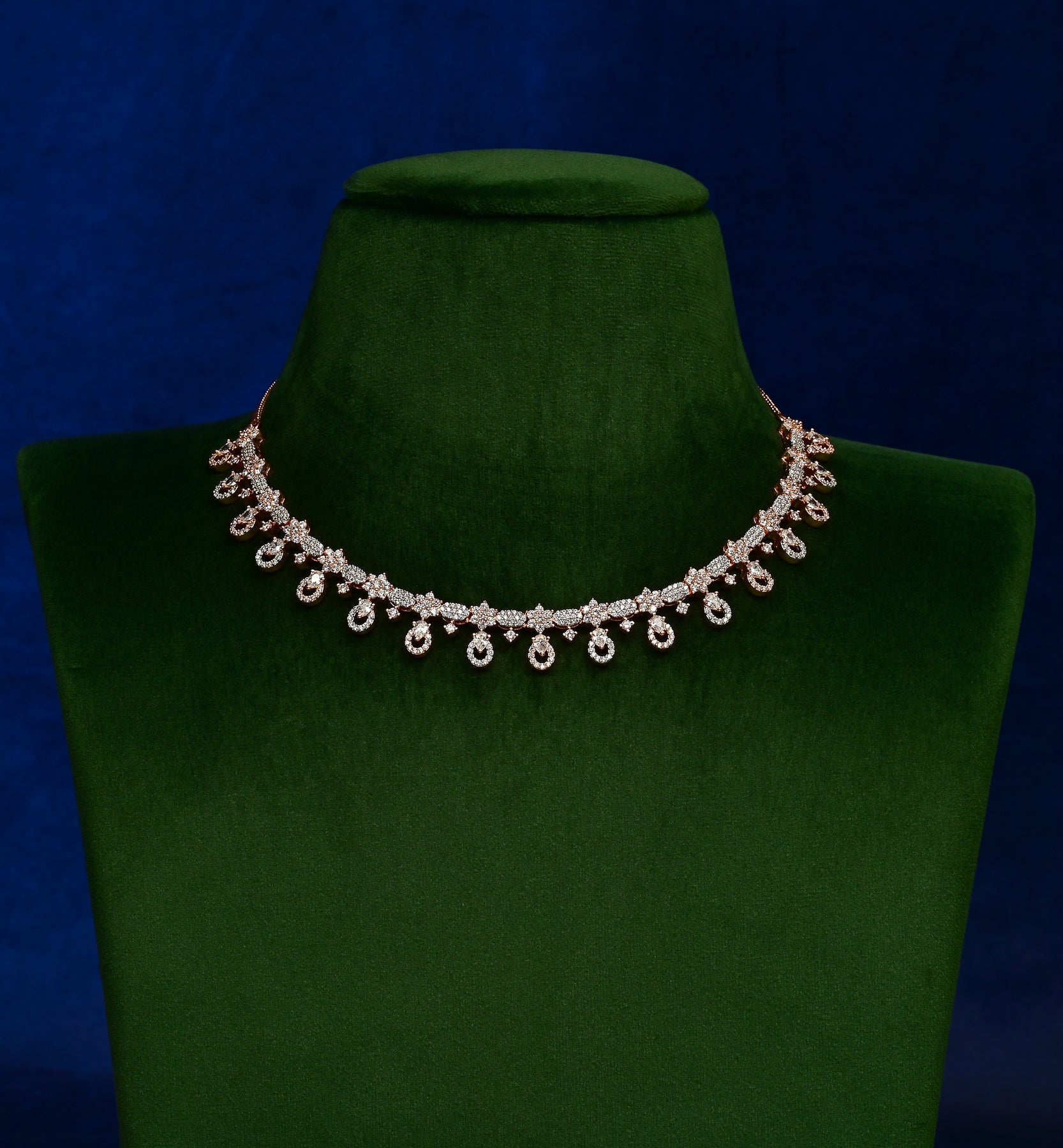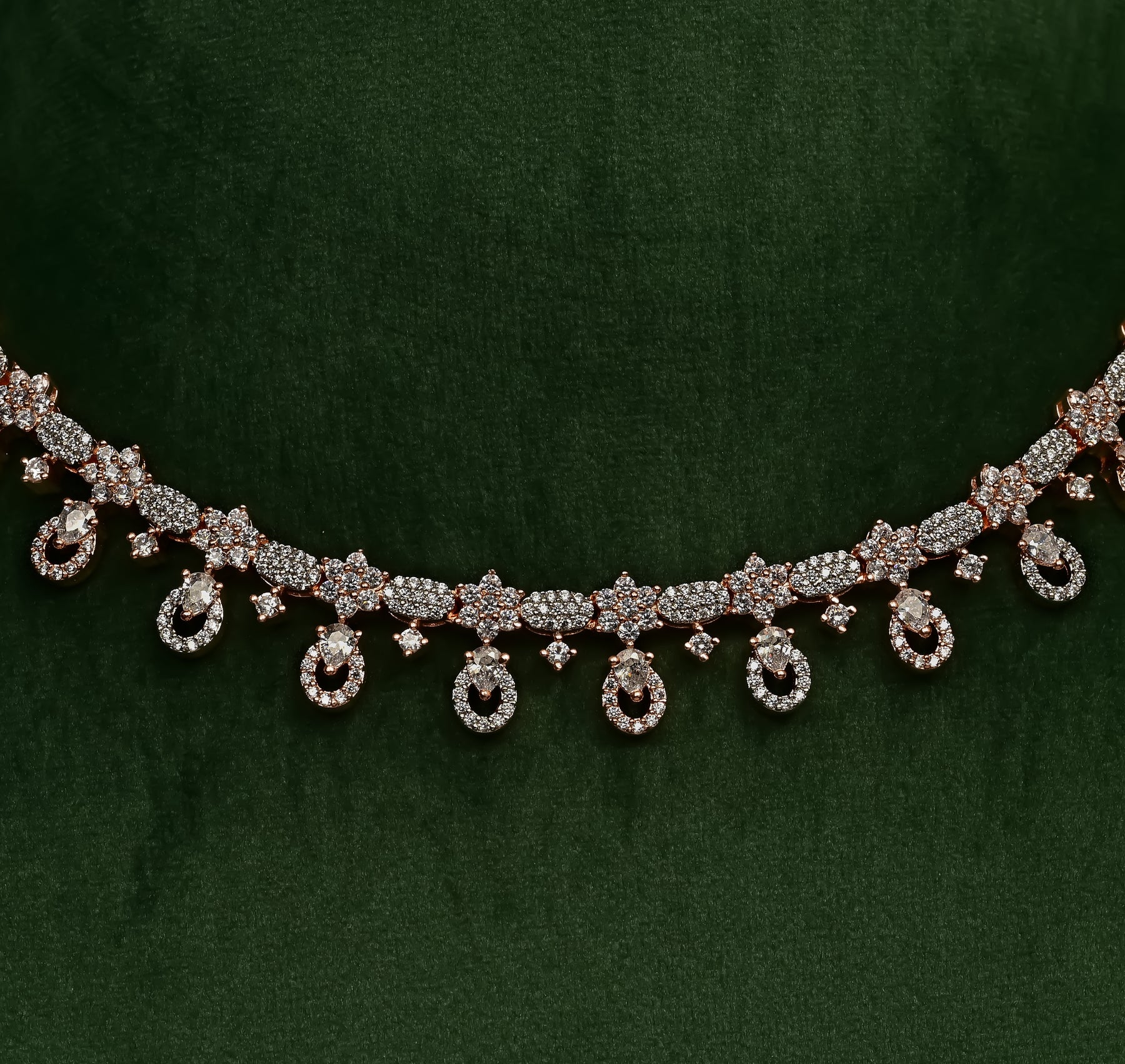 Meticulously hand-crafted, this exclusive CZ necklace set features genuine cubic zirconia stones that brilliantly mimic diamonds. The sophisticated rose gold finish enhances the luxurious appeal of this one-of-a-kind design. Each piece is expertly created to deliver exceptional sparkle and elegance for discerning jewelry connoisseurs.