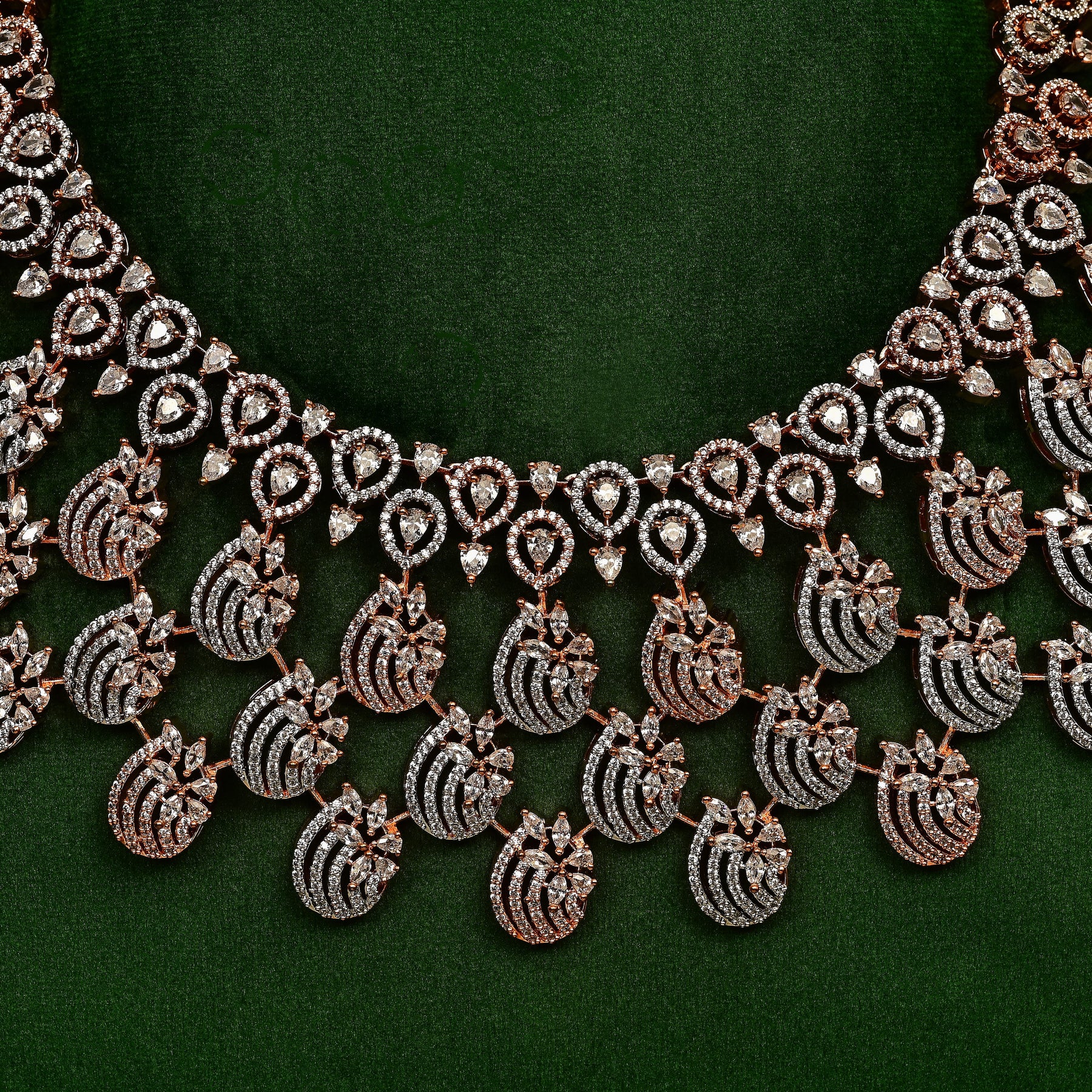 Exquisitely hand-crafted CZ necklace set featuring premium cubic zirconia stones that brilliantly mimic diamonds. Set in a sophisticated rose gold finish, this exclusive design offers unparalleled elegance. Each piece is meticulously created to ensure exceptional quality and distinctive character for the discerning jewelry connoisseur.