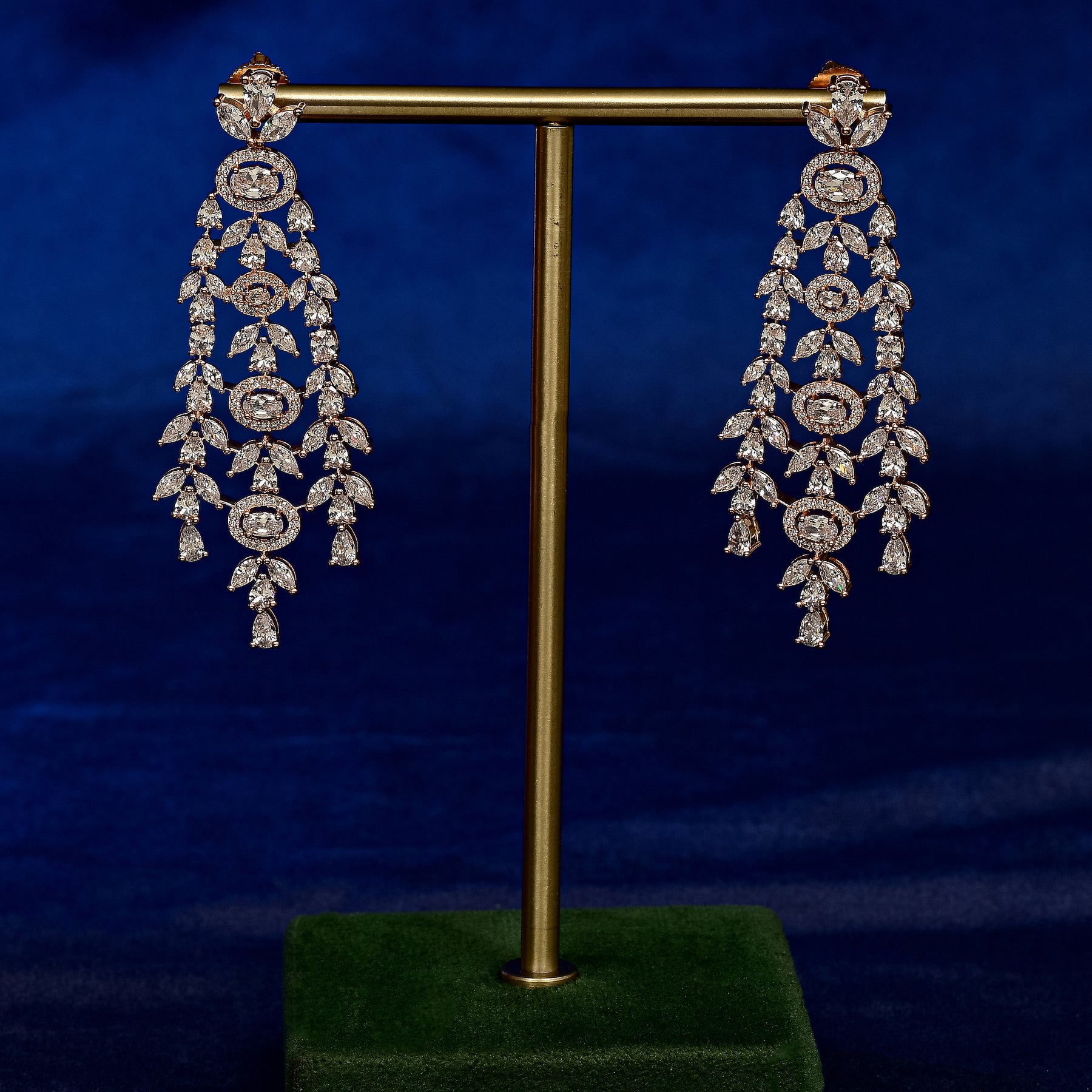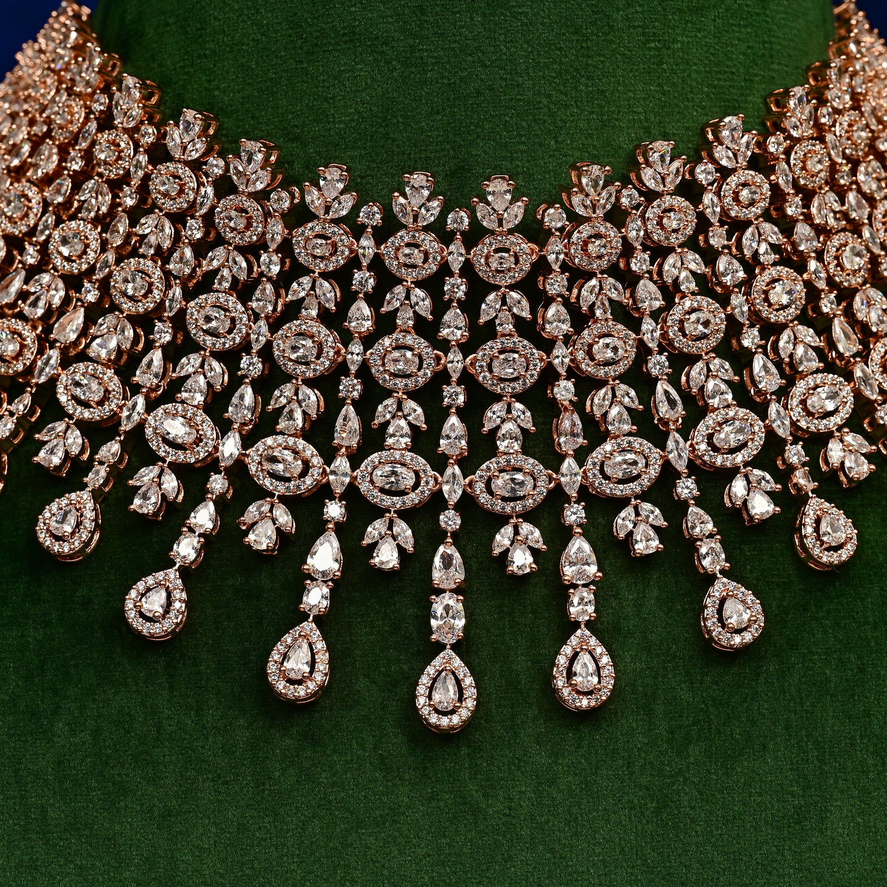 This exquisite CZ necklace set features genuine cubic zirconia stones meticulously hand-crafted to achieve a diamond-like brilliance. Set in an elegant rose gold finish, this exclusive design represents superior craftsmanship and attention to detail. The unique, one-of-a-kind arrangement makes this piece a distinguished addition to any fine jewelry collection.