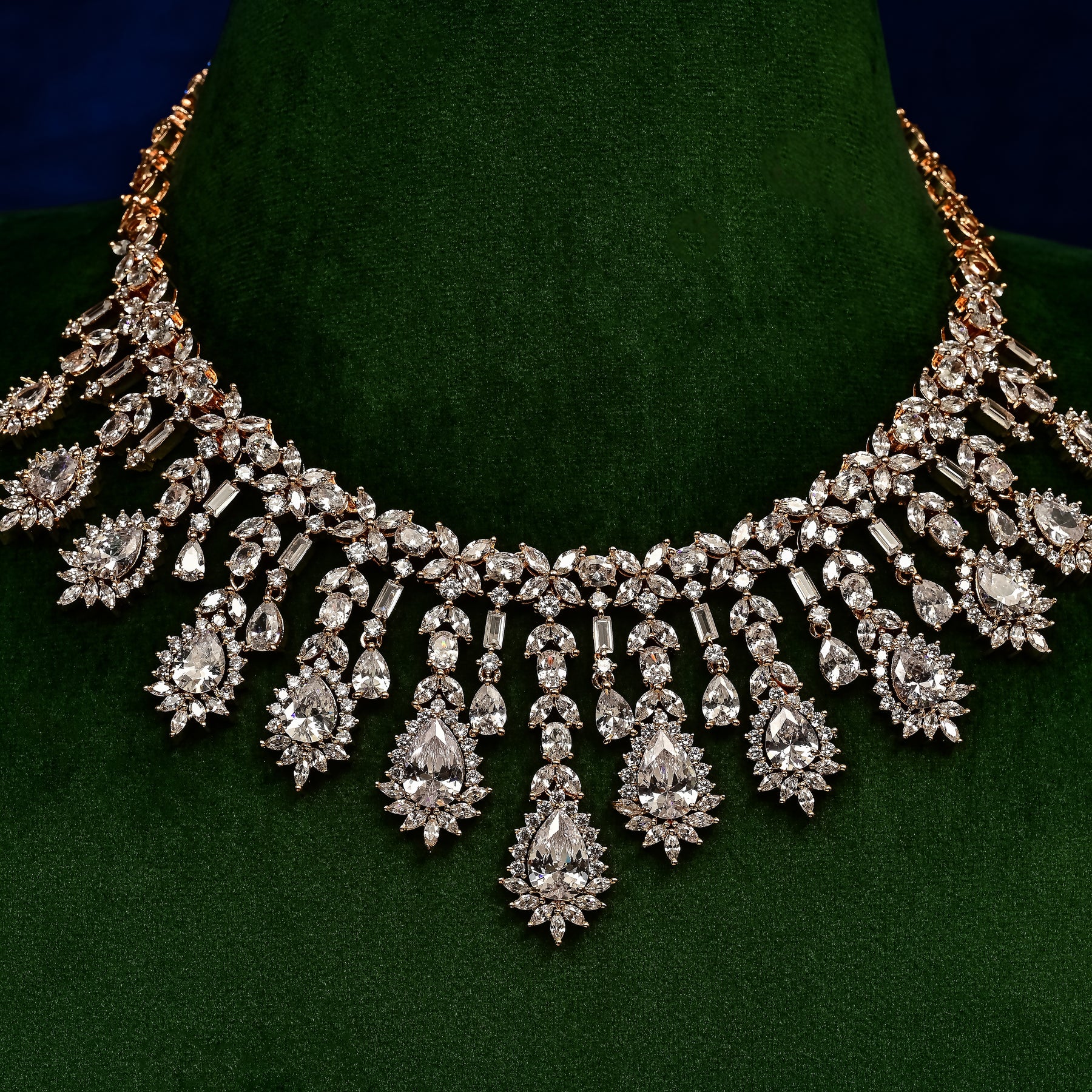 Meticulously hand-crafted, this exclusive CZ necklace set features genuine cubic zirconia stones that brilliantly mimic diamonds. The sophisticated rose gold finish enhances the luxurious appeal of this one-of-a-kind design. Each piece is expertly created to deliver exceptional sparkle and elegance for discerning jewelry connoisseurs.