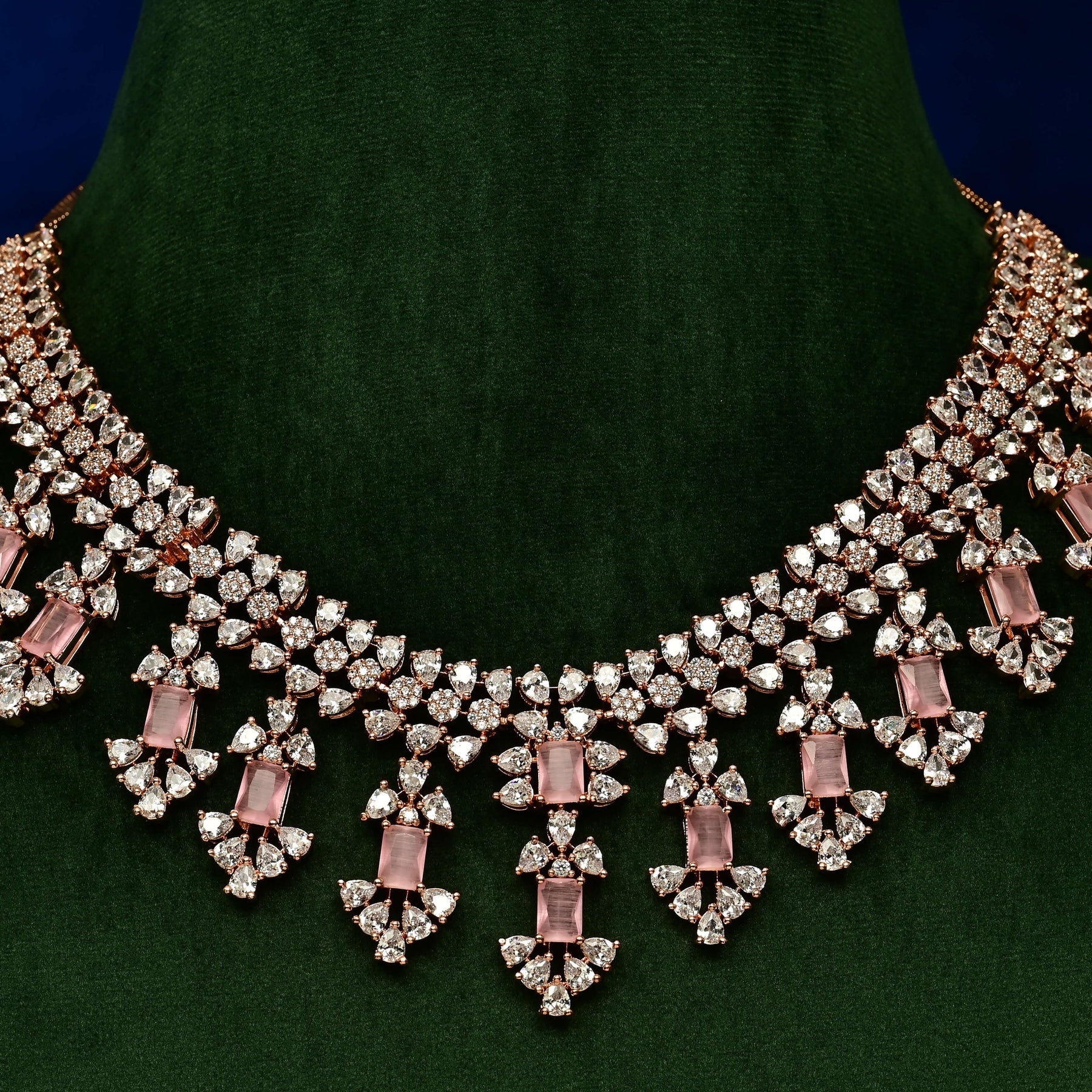 This exquisite CZ necklace set features meticulously hand-crafted designs with real cubic zirconia stones, offering the brilliance of diamonds at an exceptional value. Finished in elegant rose gold, each piece showcases a unique, exclusive design that enhances any ensemble with refined sophistication. Perfect for those seeking a one-of-a-kind accessory that combines expert craftsmanship with timeless beauty.