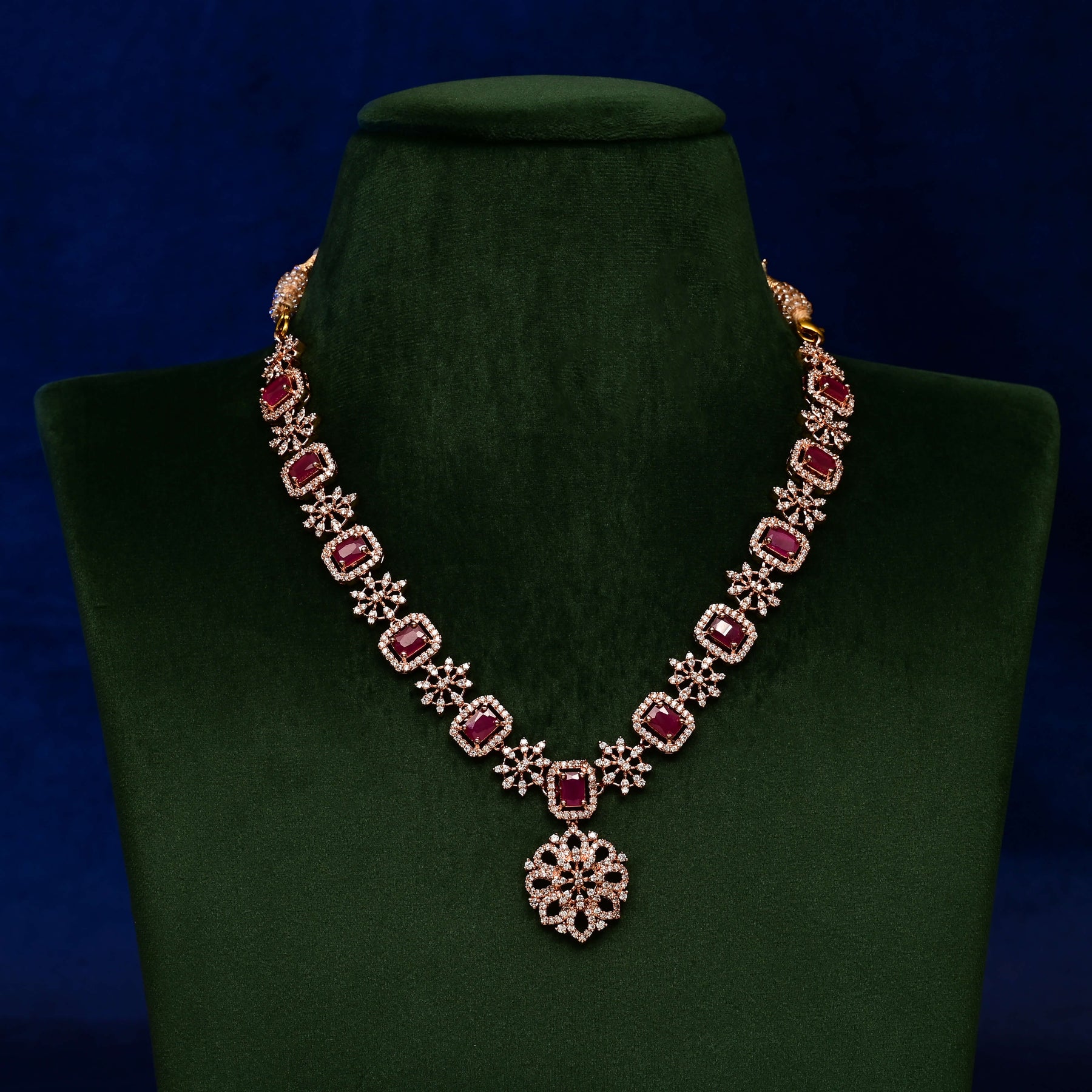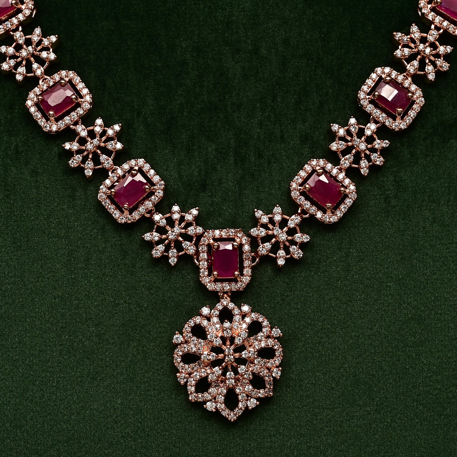 This exquisite CZ necklace set features genuine cubic zirconia stones, meticulously hand-crafted to emulate the brilliance of diamonds. Finished in elegant rose gold, its exclusive, one-of-a-kind design offers a sophisticated and timeless appeal, perfect for elevating any ensemble with expert craftsmanship and refined style.