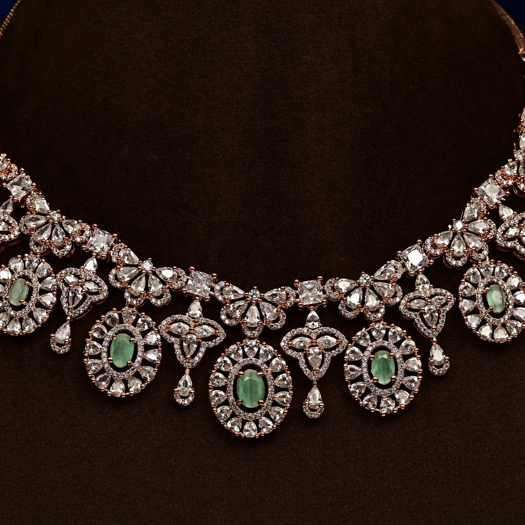 This CZ Necklace Set features expertly handcrafted designs with genuine CZ stones, offering the brilliance and elegance of diamonds in a rose gold finish. Each piece is uniquely crafted, ensuring an exclusive and one-of-a-kind accessory that enhances any ensemble with timeless sophistication. Perfect for those seeking luxury with exceptional craftsmanship.
