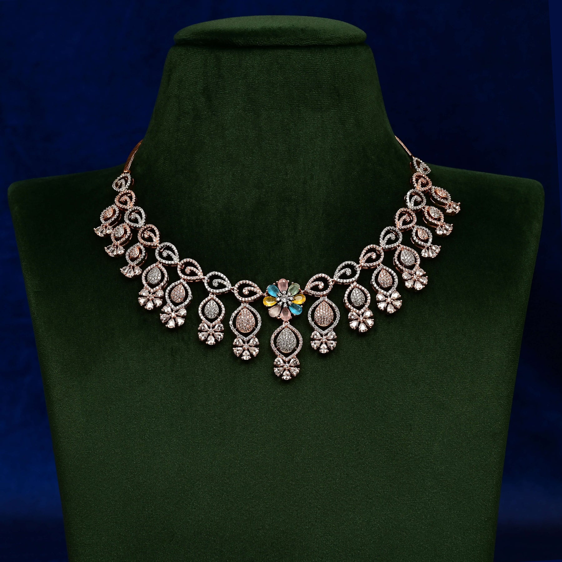 This CZ Necklace Set features genuine cubic zirconia stones meticulously handcrafted with a rose gold finish. Each piece is uniquely designed, offering an exclusive accessory that combines elegance with expert craftsmanship. Perfect for adding a refined touch to any ensemble.