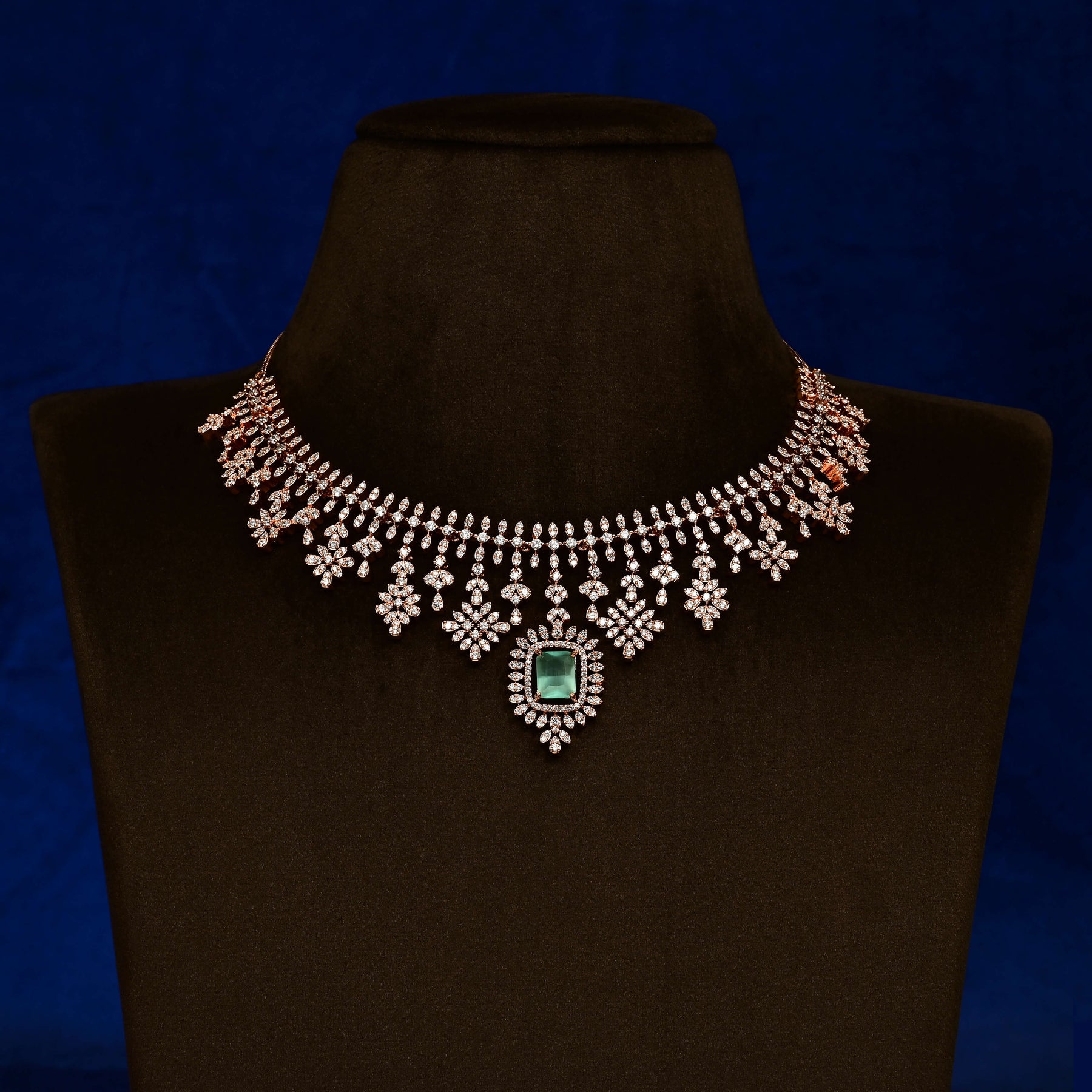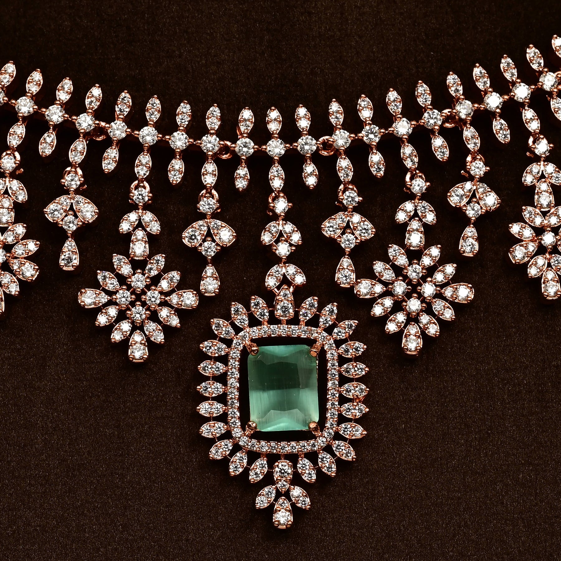This CZ Necklace Set features genuine cubic zirconia stones, meticulously handcrafted with a rose gold finish. Each piece is uniquely designed, offering an exclusive accessory that combines elegance with expert craftsmanship. Perfect for adding a refined touch to any ensemble.
