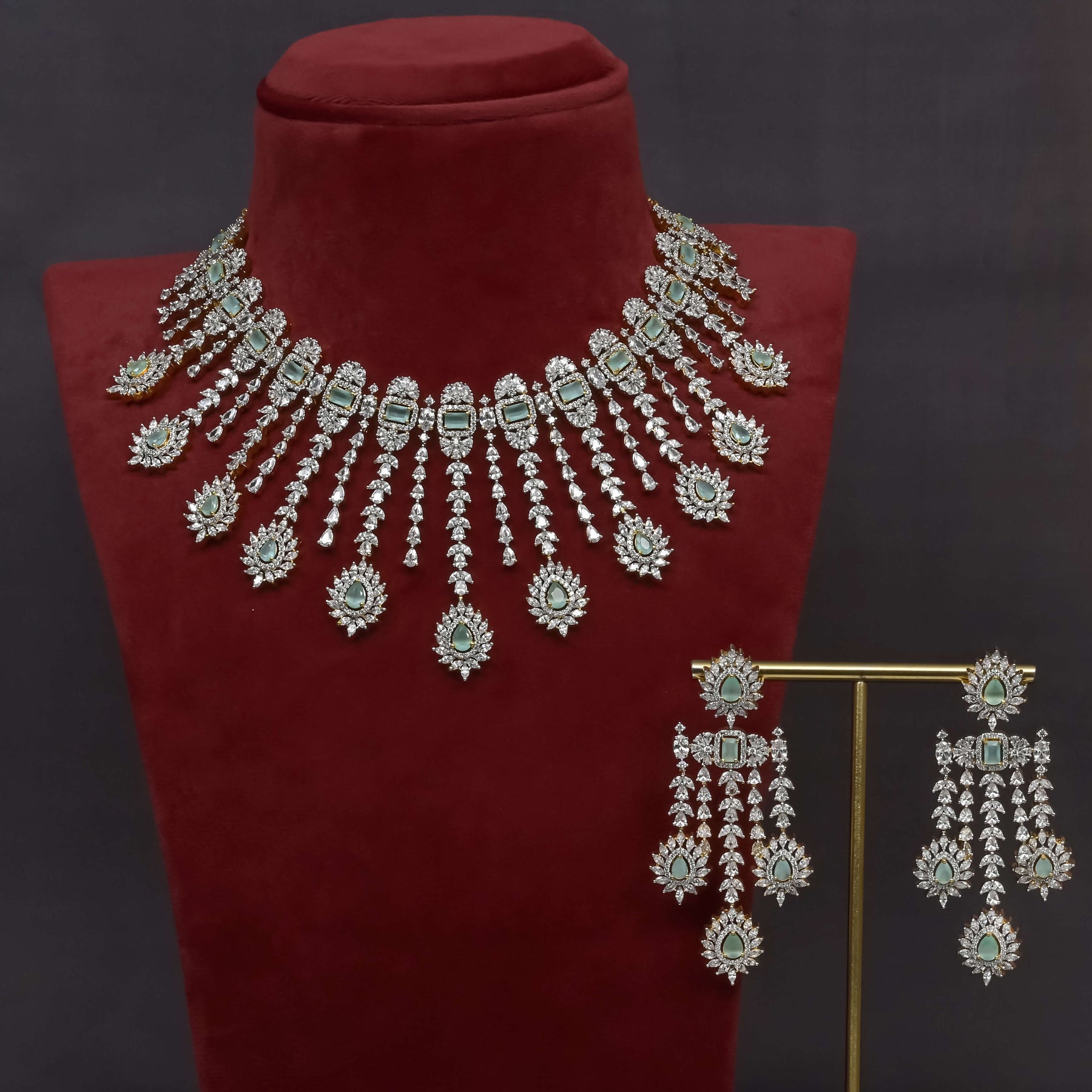 This CZ Necklace Set features expertly handcrafted designs that mimic the brilliance of diamonds through meticulous diamond-like finishing. Adorned with genuine CZ stones, each piece offers a unique and exclusive look, combining elegance with exceptional craftsmanship for a timeless accessory.
