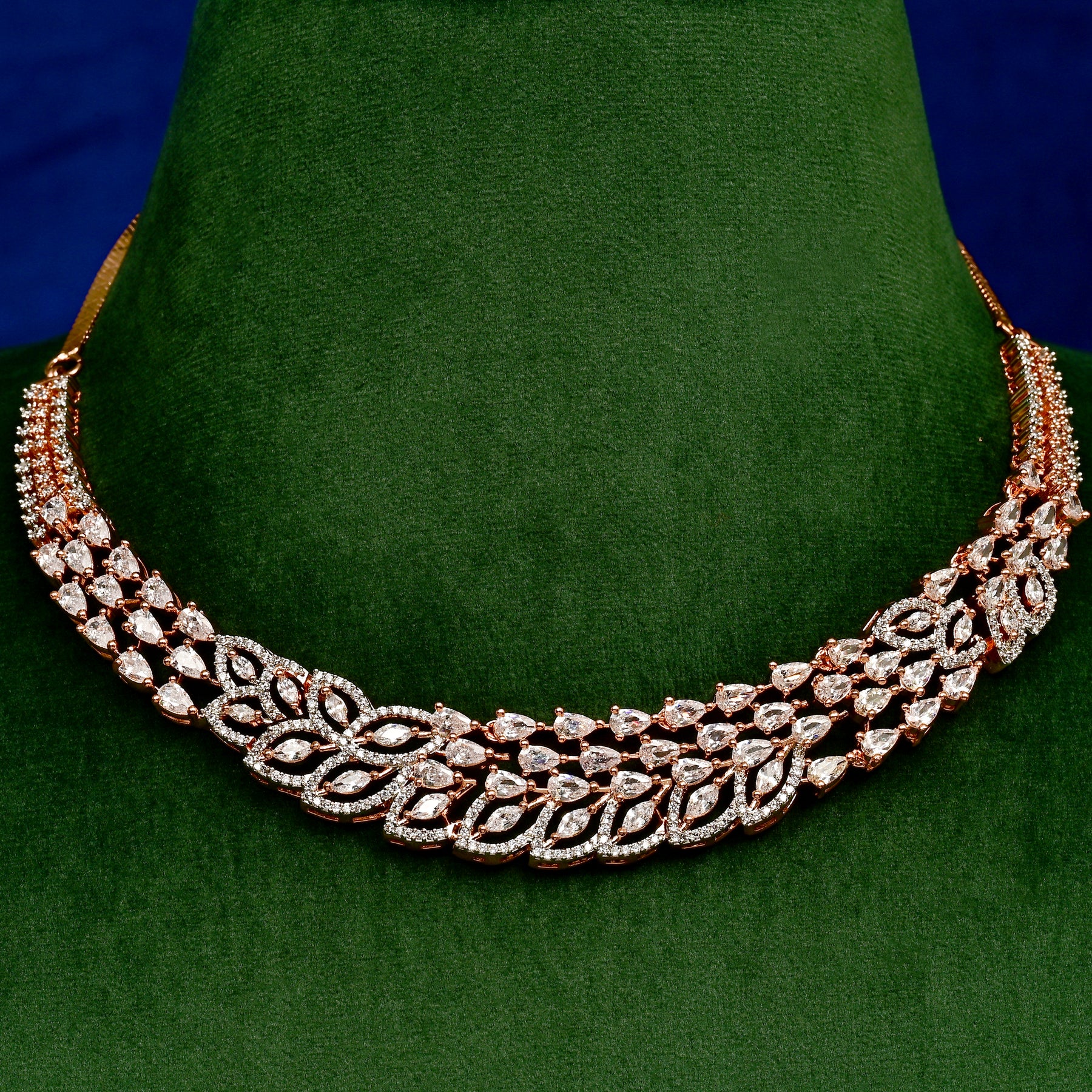 This exquisite CZ Necklace Set features genuine cubic zirconia stones meticulously hand-crafted to achieve diamond-like brilliance. Set in an elegant rose gold finish, this exclusive design represents exceptional craftsmanship and attention to detail. The unique, one-of-a-kind arrangement makes this set a distinguished addition to any fine jewelry collection.