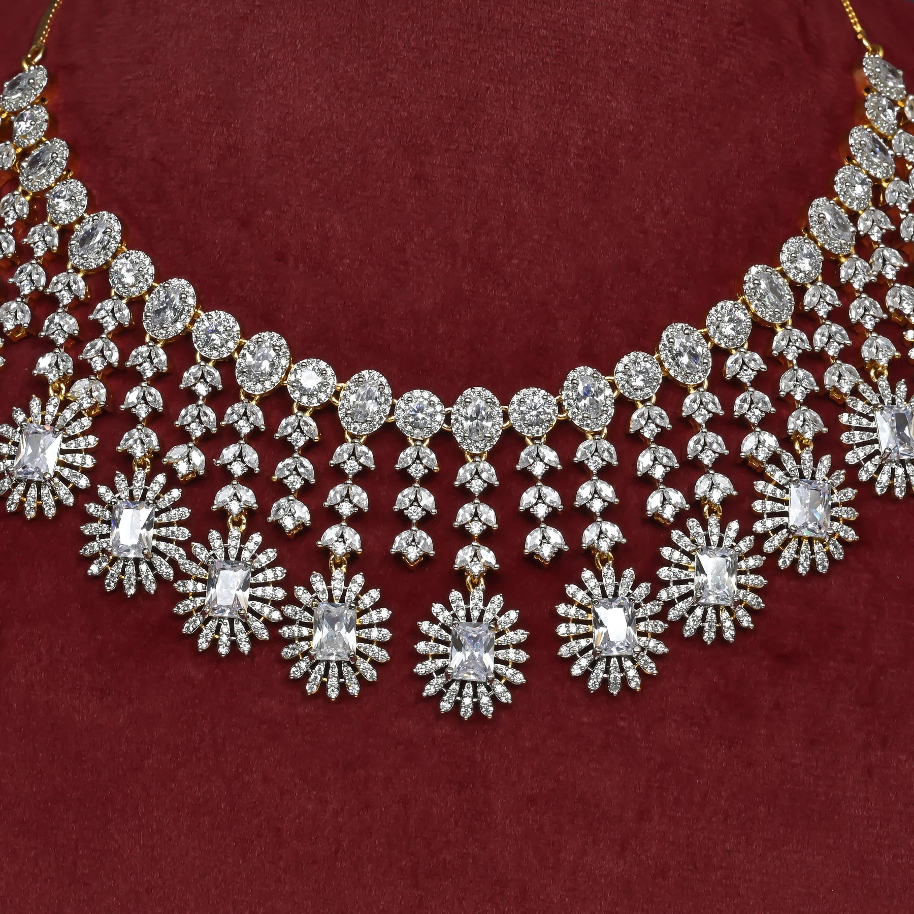 This CZ Necklace Set features expertly hand-crafted designs that mimic the brilliance of diamonds through meticulous diamond-like finishing. Adorned with genuine CZ stones, it offers a unique and exclusive style that stands out for its craftsmanship and elegance. Perfect for those seeking the sparkle of diamonds with exceptional quality and distinctive design.