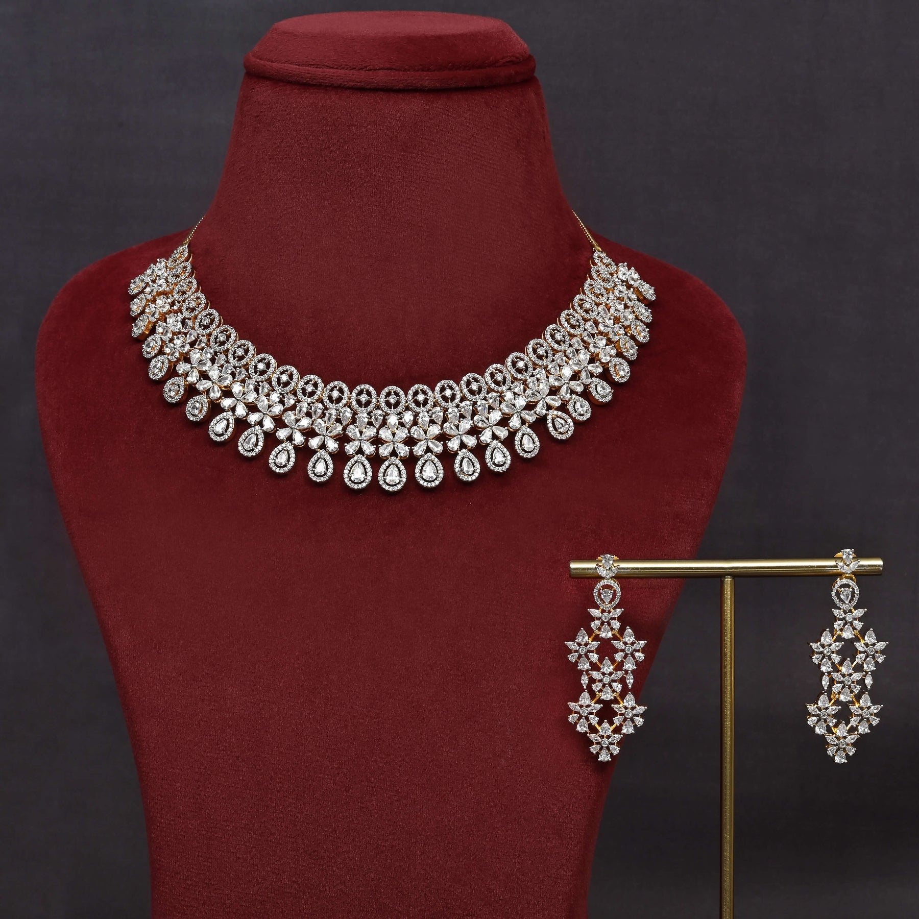 This CZ Necklace Set features expertly handcrafted designs that mimic the brilliance of diamonds with meticulous diamond-like finishing. Adorned with genuine CZ stones, each piece offers a unique and exclusive style, perfect for those seeking elegance with exceptional craftsmanship.