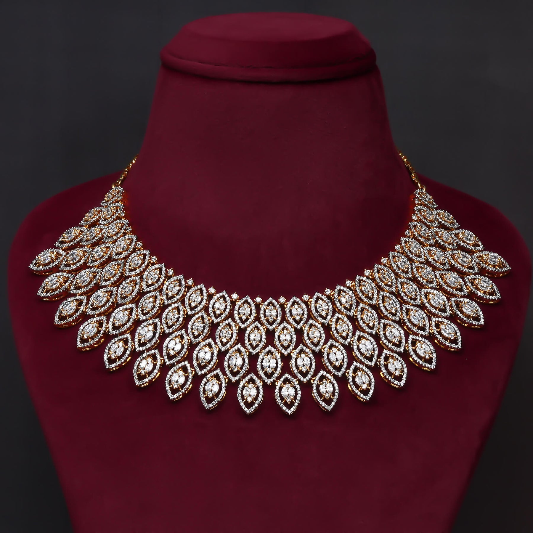 This CZ Necklace Set features expertly handcrafted designs that mimic the brilliance of diamonds through meticulous diamond-like finishing. Adorned with genuine CZ stones, each piece offers a unique and exclusive style, perfect for those seeking elegance with exceptional craftsmanship.