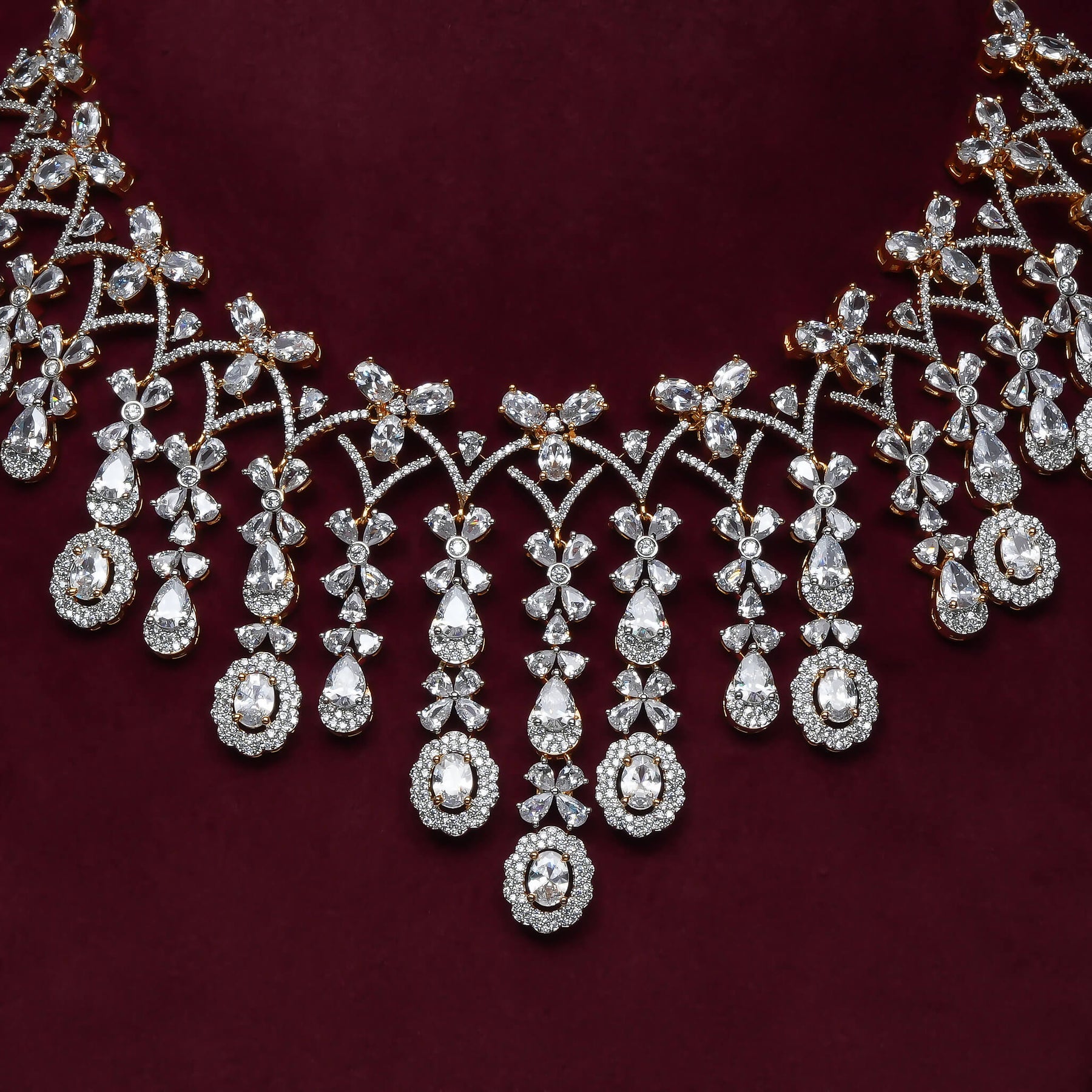 This CZ Necklace Set features expertly handcrafted designs that mimic the brilliance of diamonds through meticulous diamond-like finishing. Adorned with genuine CZ stones, each piece offers a unique and exclusive style, combining elegance with exceptional craftsmanship for a timeless look.
