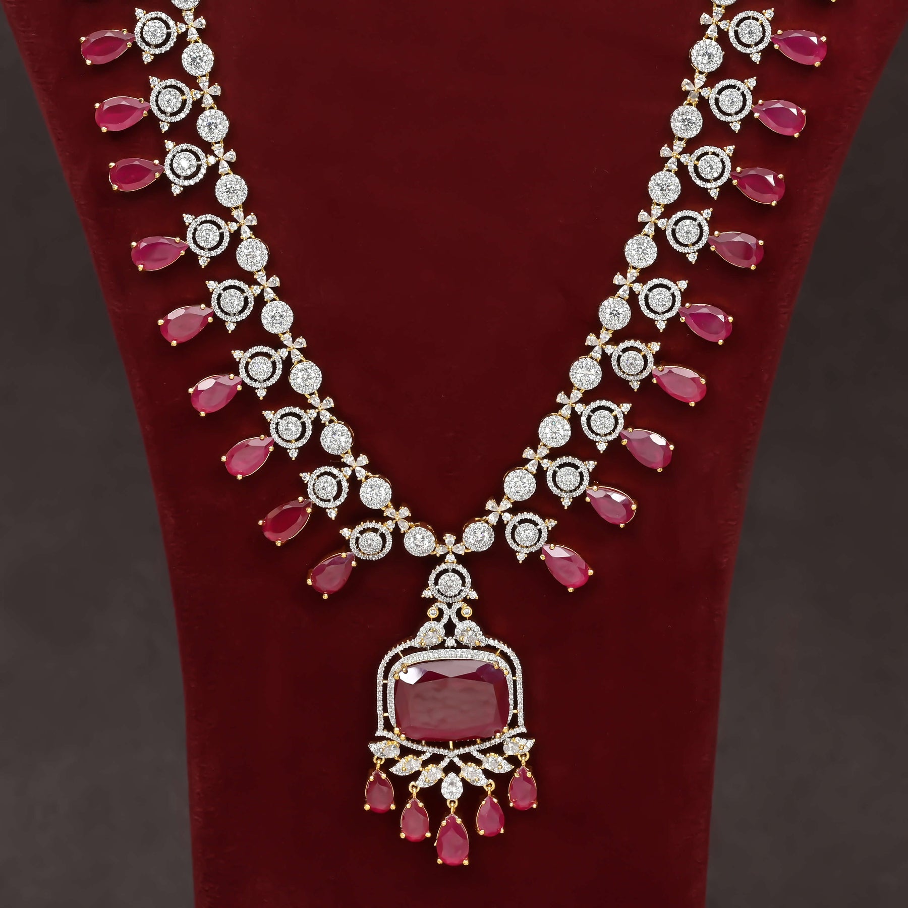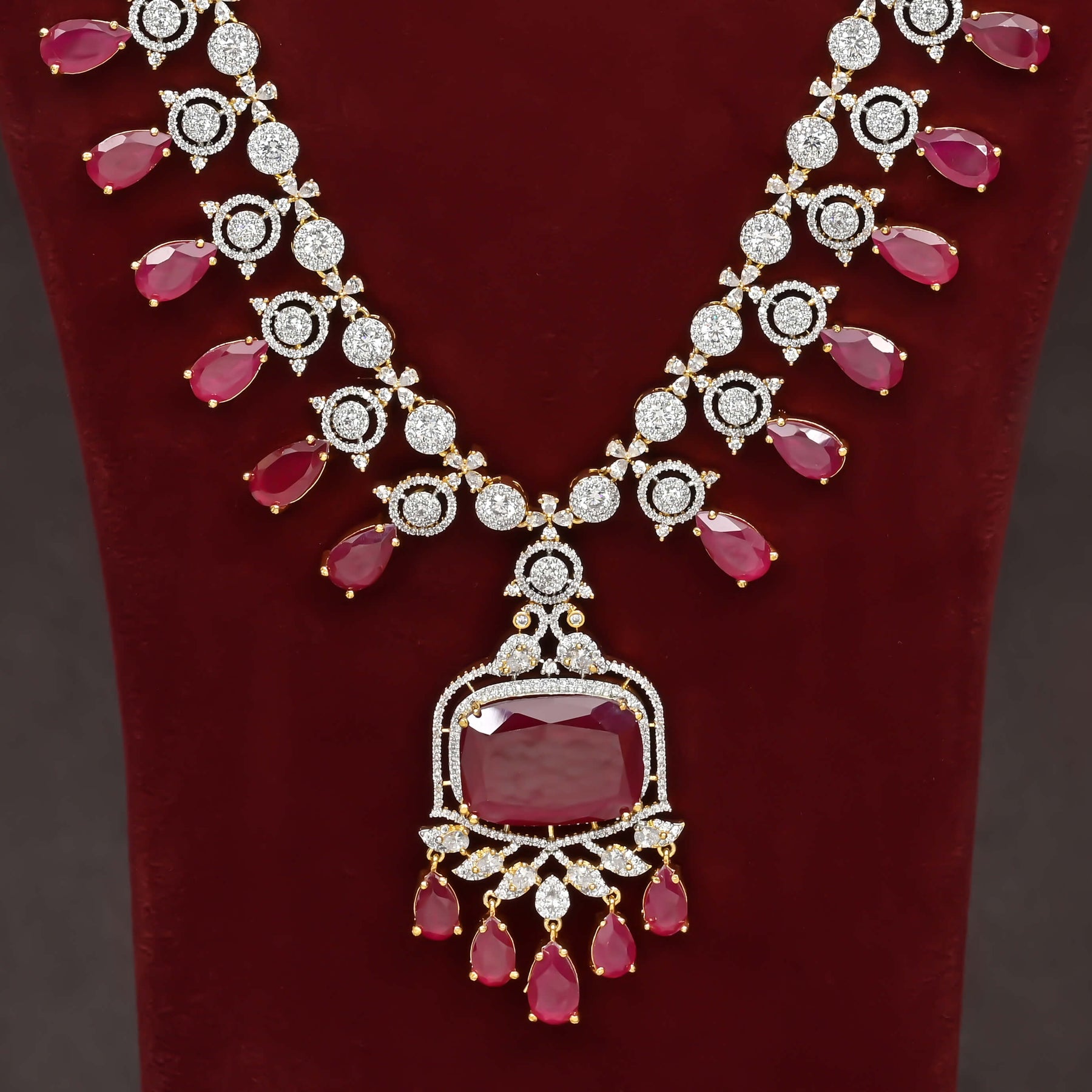 Elevate your collection with this exquisite CZ Necklace Set, meticulously handcrafted to deliver timeless elegance. Featuring authentic cubic zirconia stones paired with semi-precious ruby accents, this piece captures a regal aesthetic with remarkable brilliance. Each design is uniquely crafted, ensuring you own a one-of-a-kind treasure that stands apart. The expert artisanship creates a sophisticated royal look suitable for special occasions or refined everyday wear. A statement piece that combines quality craftsmanship with distinctive design.