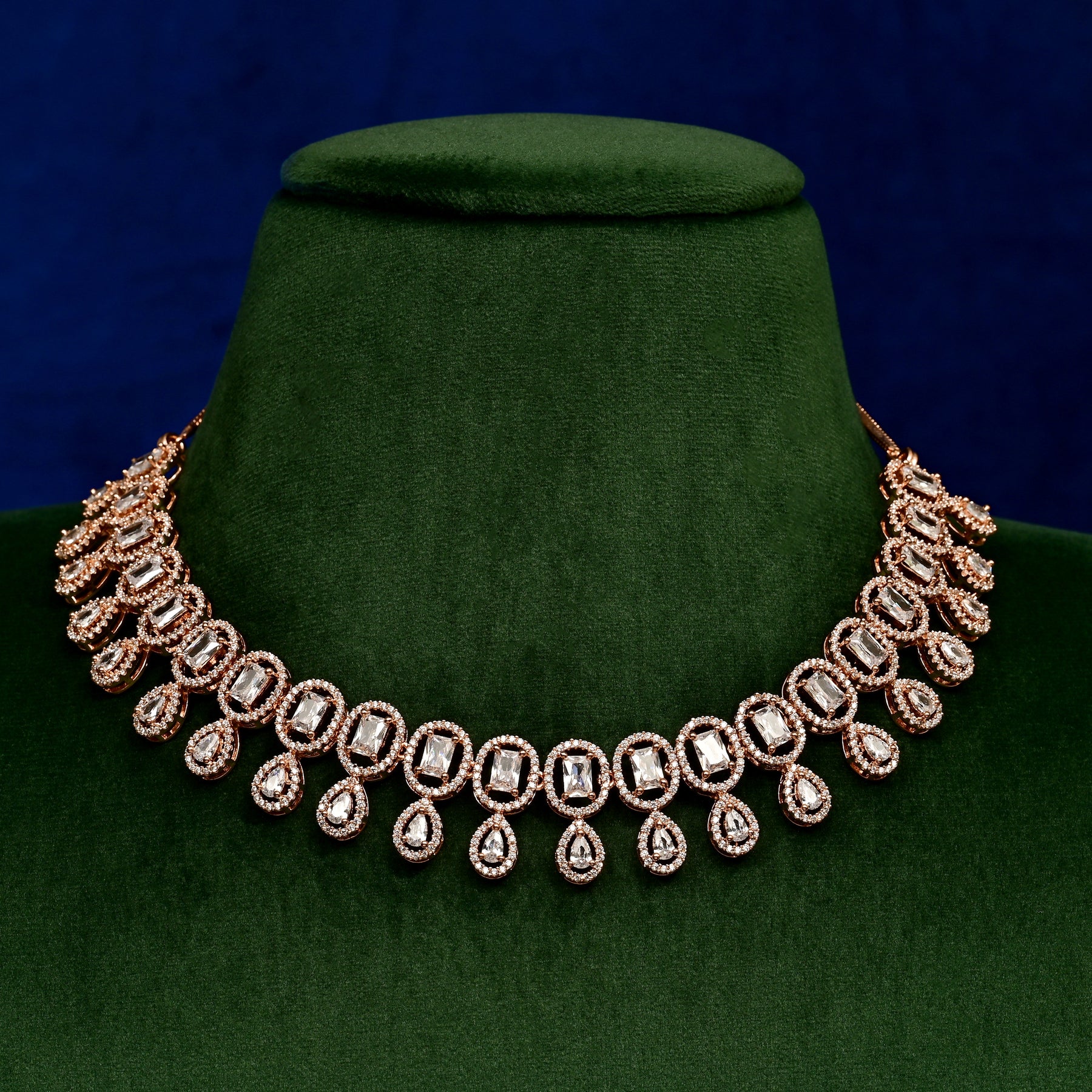 This exquisite CZ Necklace Set features genuine cubic zirconia stones meticulously hand-crafted to achieve diamond-like brilliance. Set in an elegant rose gold finish, this exclusive design represents exceptional craftsmanship and sophistication. The unique, one-of-a-kind arrangement ensures you're investing in a truly distinctive piece of fine jewelry that captures light with remarkable precision.