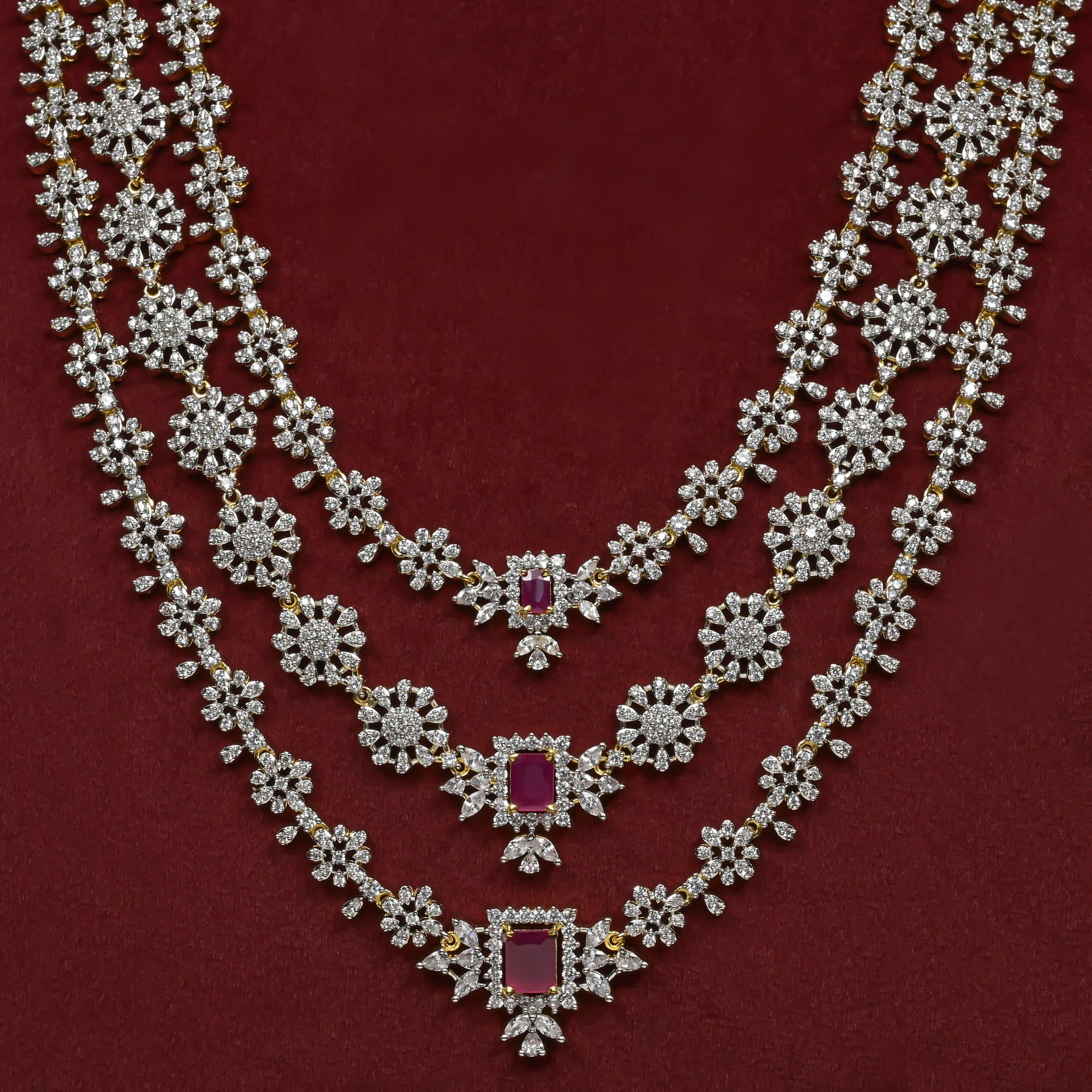 Elevate your collection with this exquisite handcrafted CZ necklace set, featuring authentic cubic zirconia stones paired with semi-precious ruby accents. Each piece showcases a distinctive one-of-a-kind design that captures regal sophistication and timeless elegance. The meticulous craftsmanship delivers a royal aesthetic, making it an ideal choice for special occasions or as a statement accessory that reflects refined taste and individuality.