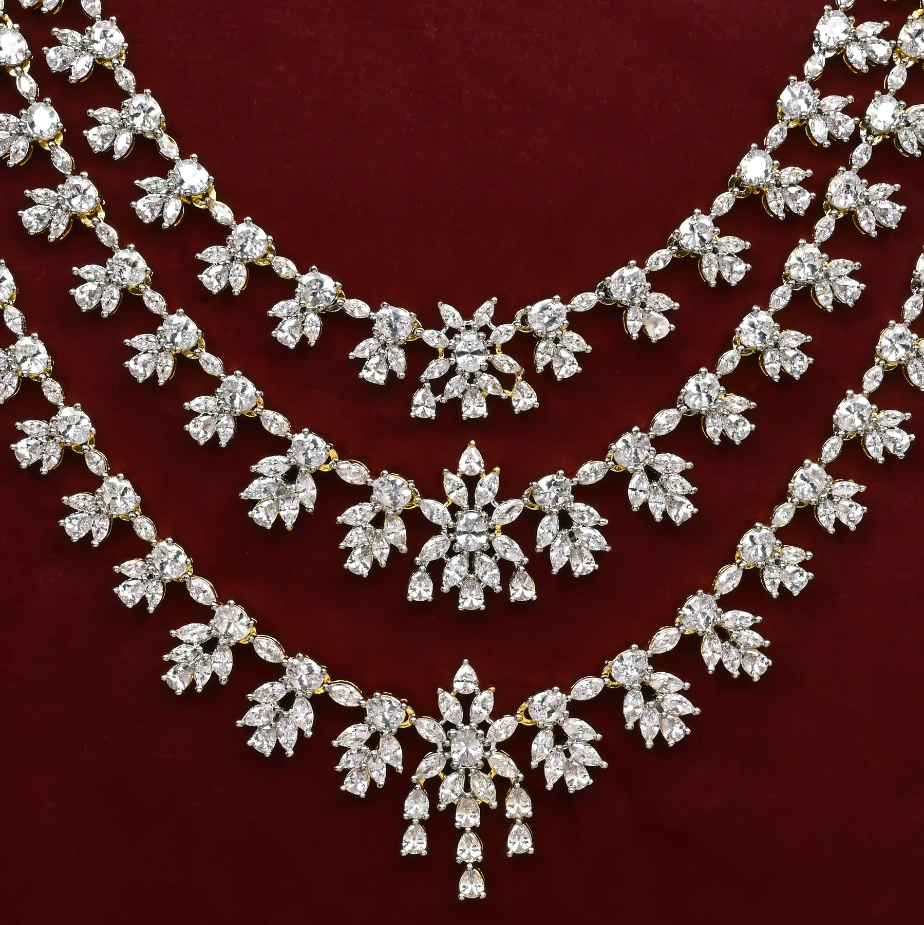 Elevate your jewelry collection with this exquisite CZ Necklace Set, featuring authentic cubic zirconia stones that deliver brilliant sparkle and sophistication. The multi-layered design creates dimensional depth, while meticulous handcrafting ensures each piece showcases refined artistry. With its regal aesthetic and distinctive one-of-a-kind design, this necklace set makes a striking statement for special occasions or elevated everyday wear. Experience the luxury of fine jewelry craftsmanship at an accessible price point.