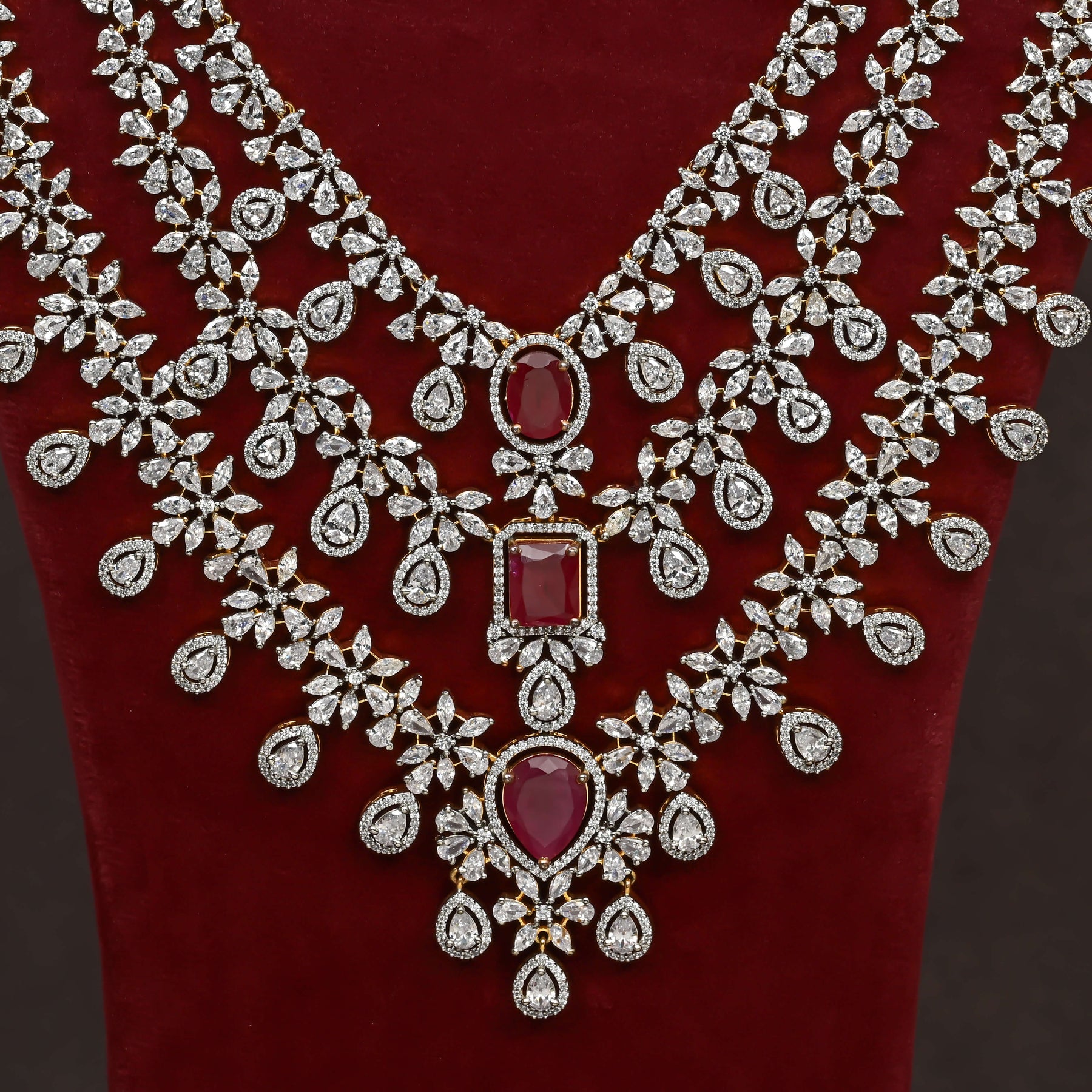 Elevate your collection with this exquisite CZ Necklace Set, meticulously handcrafted to deliver timeless elegance. Featuring authentic cubic zirconia stones paired with semi-precious ruby accents, this piece captures a regal aesthetic with remarkable brilliance. Each design is uniquely crafted, ensuring you own a one-of-a-kind treasure that stands apart. The expert combination of premium materials and artisanal craftsmanship creates a sophisticated statement piece suitable for both special occasions and refined everyday wear.