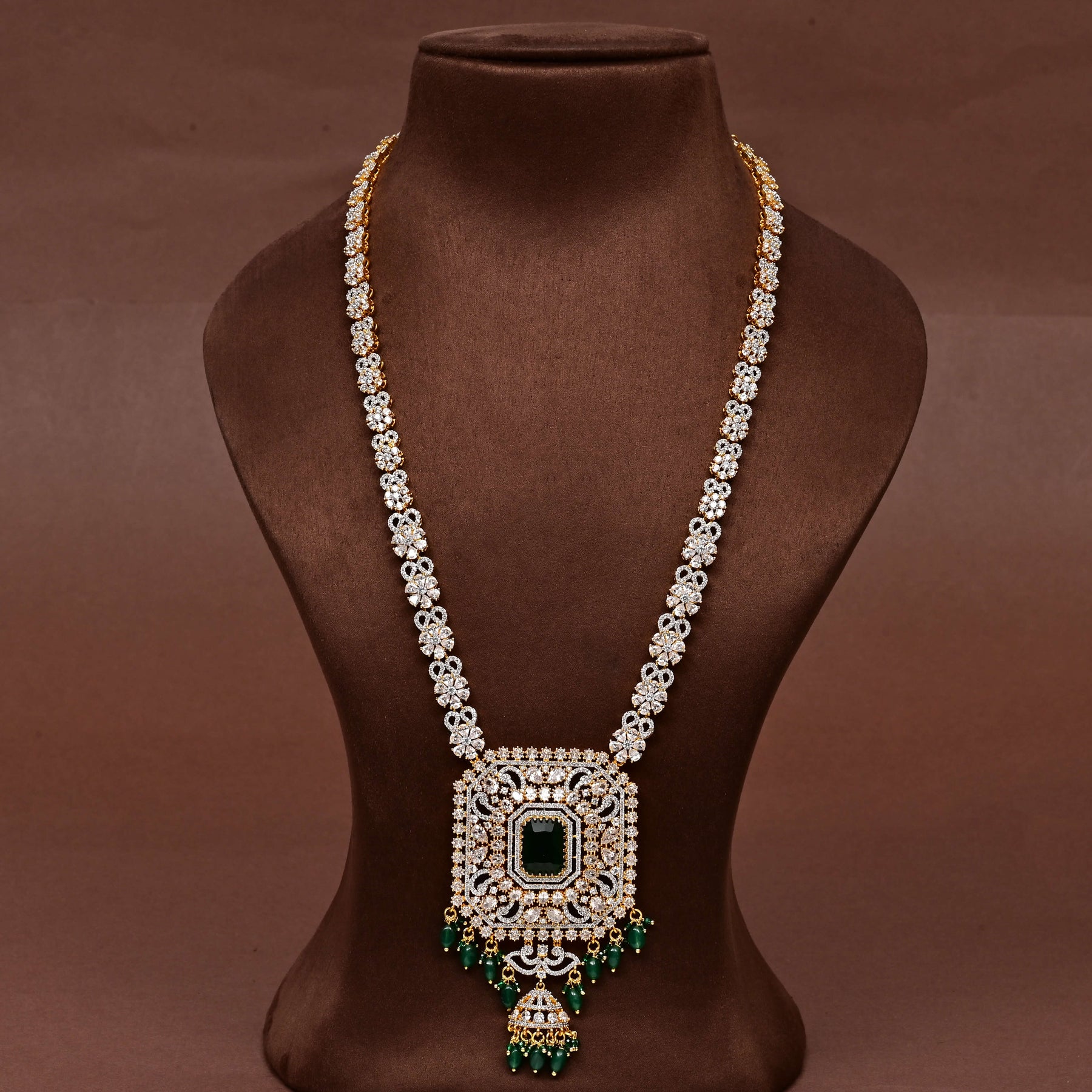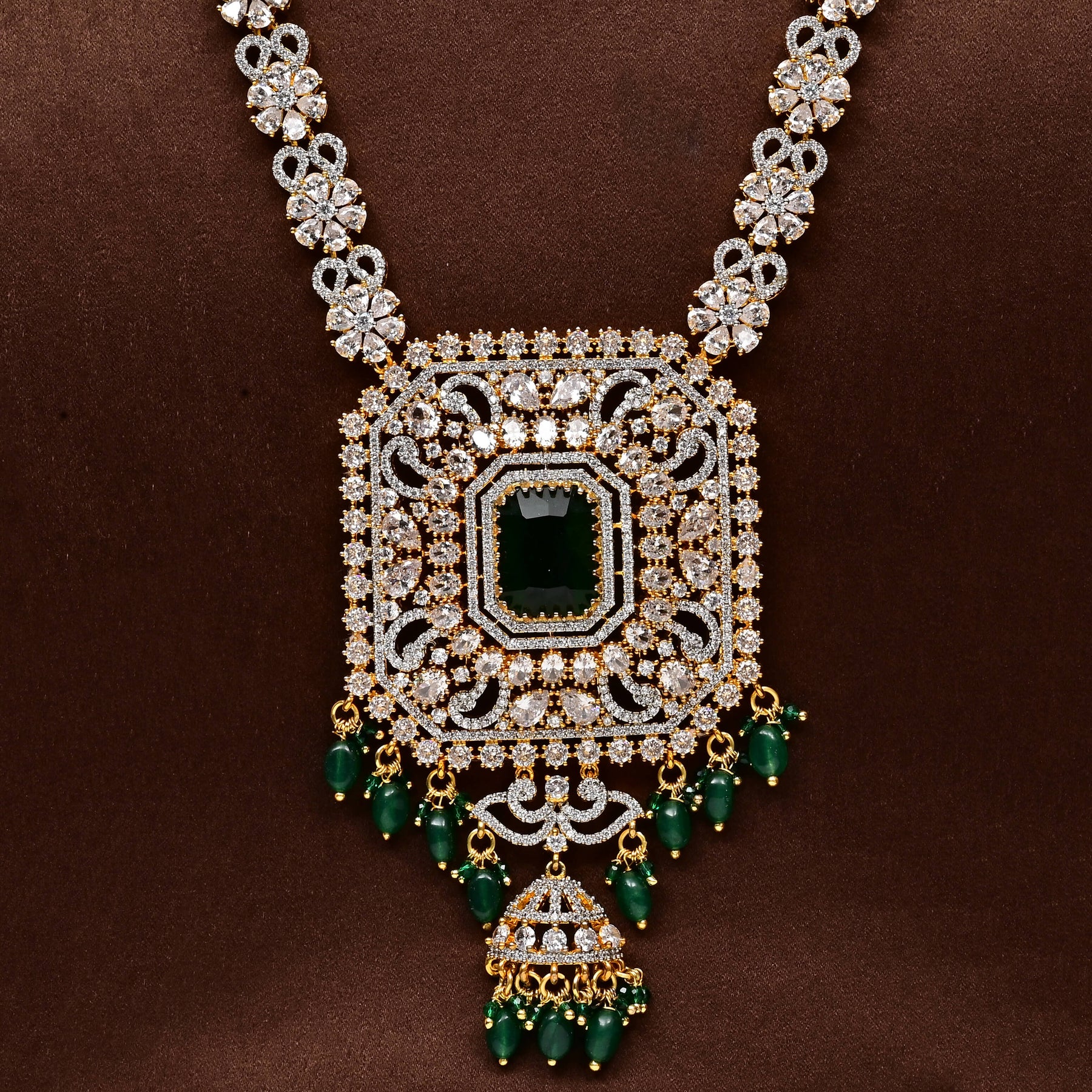 Elevate your collection with this exquisite CZ Necklace Set, meticulously handcrafted to deliver timeless elegance. Featuring authentic cubic zirconia stones paired with semi-precious emerald accents, this piece captures a regal aesthetic that commands attention. Each design is uniquely created, ensuring you own a one-of-a-kind treasure that reflects refined taste and sophisticated style. Perfect for special occasions or as a statement addition to your everyday wear.