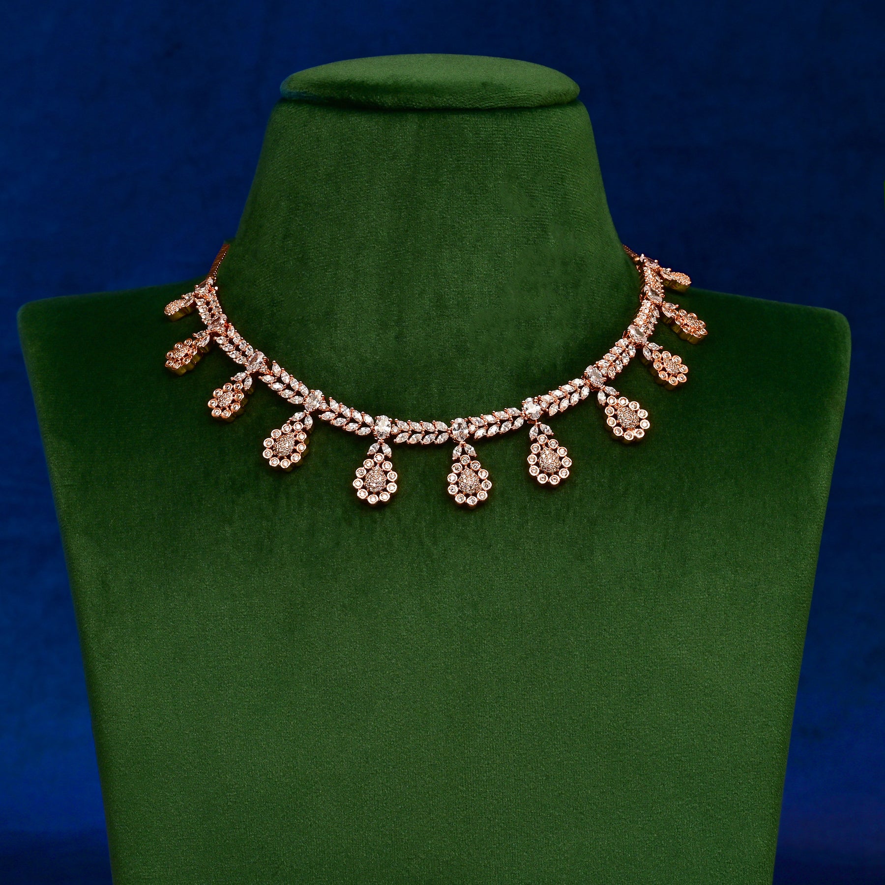 Exquisitely hand-crafted CZ necklace set featuring premium cubic zirconia stones that brilliantly mimic diamonds. Set in an elegant rose gold finish, this exclusive design offers sophisticated luxury. Each piece is meticulously created to ensure exceptional quality and unparalleled brilliance in this one-of-a-kind collection.