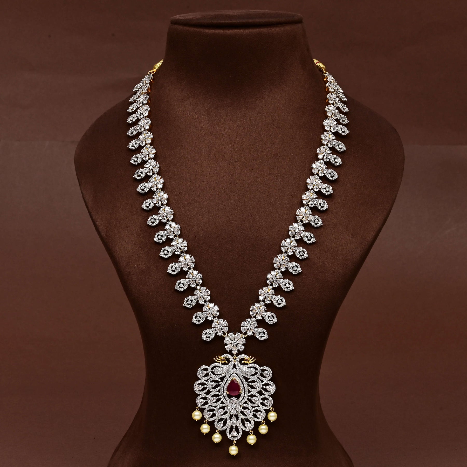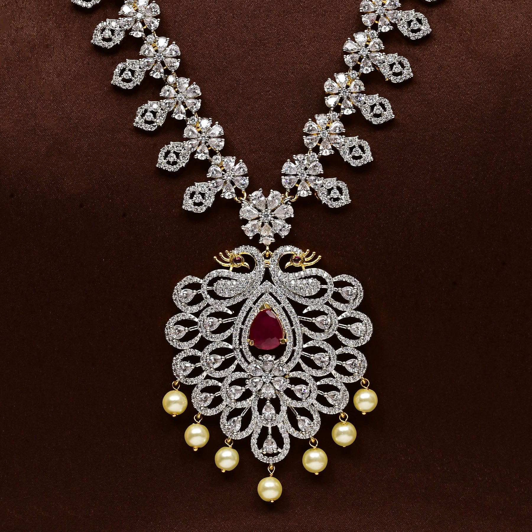 Elevate your collection with this exquisite CZ Necklace Set, meticulously handcrafted to deliver timeless elegance. Featuring authentic cubic zirconia stones paired with semi-precious ruby accents, this piece captures a regal aesthetic with remarkable brilliance. Each design is uniquely created, ensuring you own a one-of-a-kind treasure that stands apart. The expert craftsmanship and luxurious composition make this necklace set an ideal choice for special occasions or as a statement accessory that commands attention.