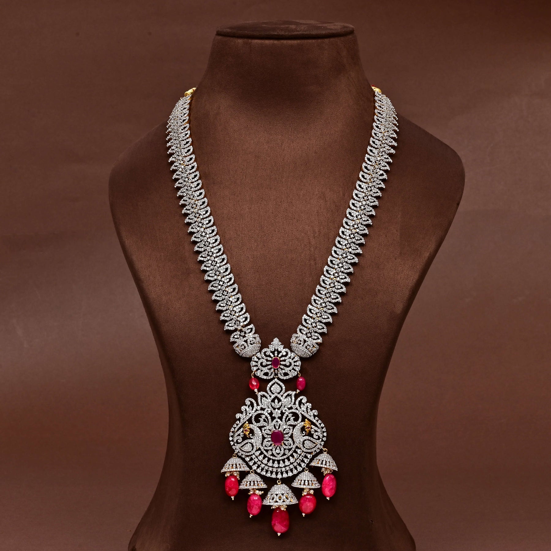 Elevate your collection with this exquisite CZ Necklace Set, featuring authentic cubic zirconia stones paired with semi-precious ruby accents. Each piece is meticulously handcrafted to deliver a regal aesthetic with distinctive, one-of-a-kind design elements. The brilliant sparkle of premium CZ stones combined with the deep richness of ruby gemstones creates a sophisticated look suitable for special occasions or refined everyday wear. This artisanal creation showcases superior craftsmanship and timeless elegance.