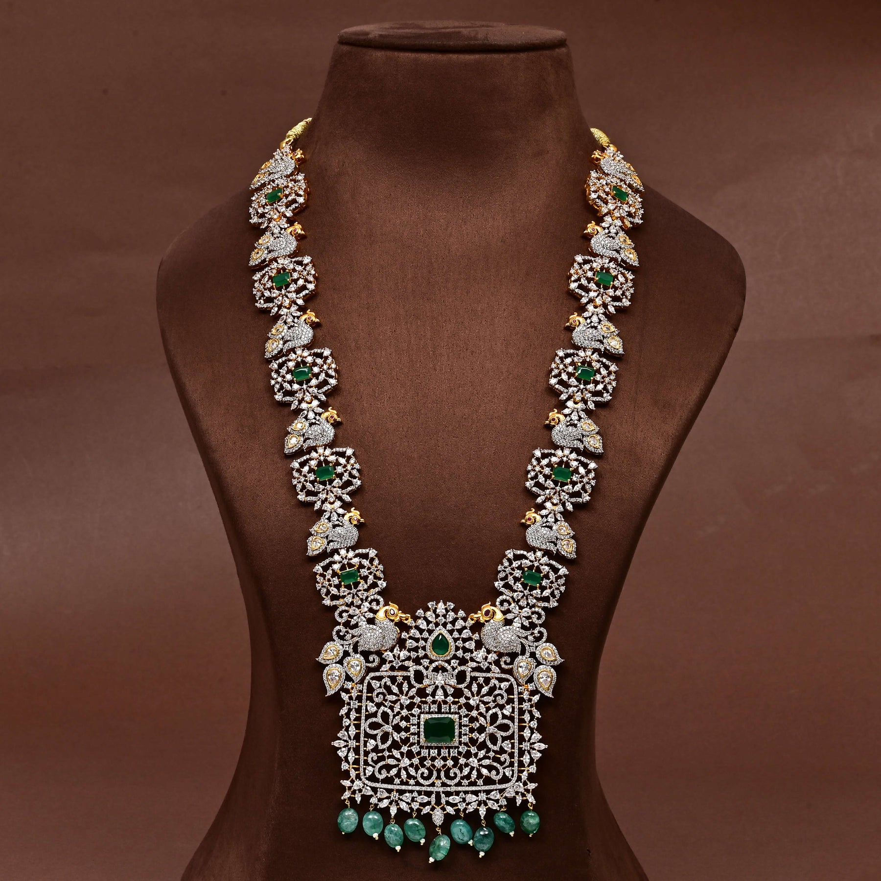 Elevate your collection with this exquisite CZ Necklace Set, featuring authentic cubic zirconia stones paired with semi-precious emerald accents. Each piece is meticulously handcrafted to deliver a regal aesthetic with distinctive, one-of-a-kind design elements. The brilliant sparkle of premium CZ stones combined with the rich green hues of emerald creates a sophisticated look suitable for special occasions or refined everyday wear. This artisanal creation showcases superior craftsmanship and timeless elegance.