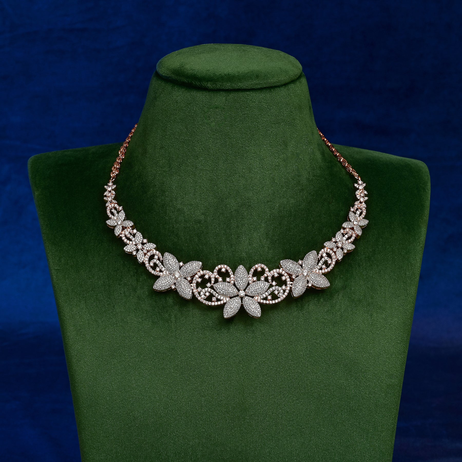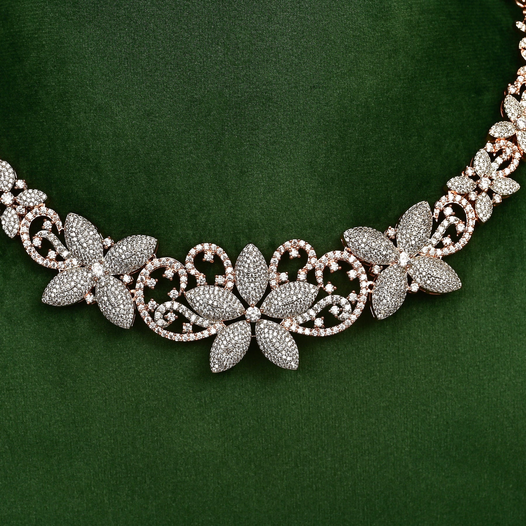 Exquisitely hand-crafted CZ necklace set featuring premium cubic zirconia stones that brilliantly mimic diamonds. Set in an elegant rose gold finish, this exclusive design offers sophisticated luxury. Each piece is meticulously created to ensure exceptional quality and unparalleled brilliance in this one-of-a-kind collection.
