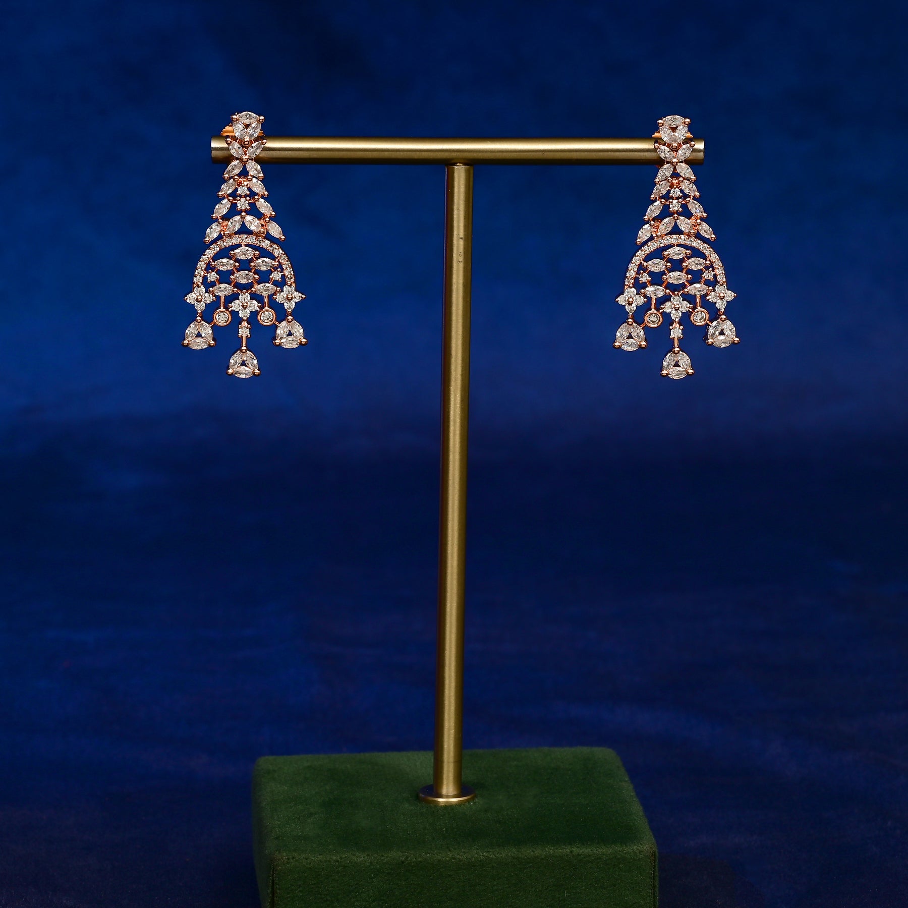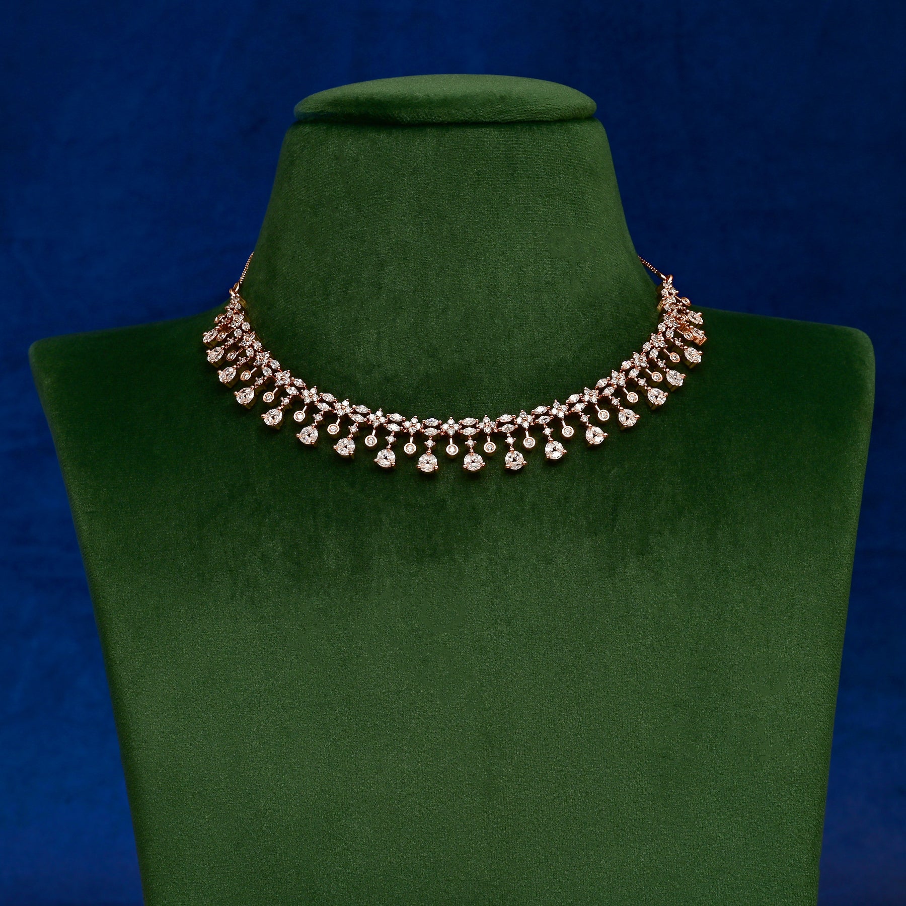 Exquisitely hand-crafted CZ necklace set featuring premium cubic zirconia stones that brilliantly mimic diamonds. Set in a sophisticated rose gold finish, this exclusive design offers unparalleled elegance. Each piece is meticulously created to ensure exceptional quality and distinctive character, making it a truly remarkable addition to any fine jewelry collection.