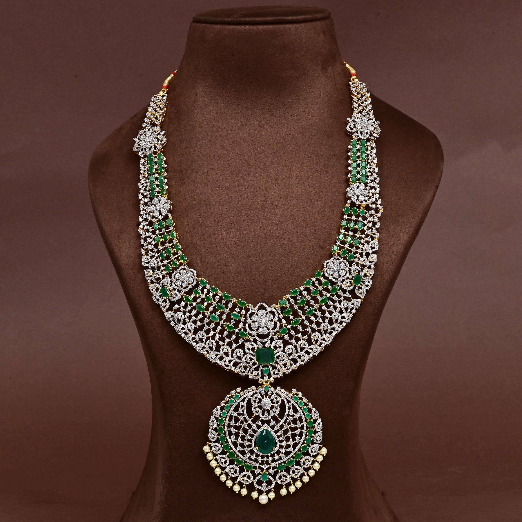 Elevate your collection with this exquisite CZ Necklace Set, meticulously handcrafted to deliver timeless elegance. Featuring authentic cubic zirconia stones in a brilliant diamond finish paired with semi-precious emerald accents, this piece captures a regal aesthetic with remarkable sparkle and depth. Each design is uniquely crafted, ensuring you own a one-of-a-kind treasure that stands apart. The expert artisanship and luxurious combination of materials create a sophisticated statement piece perfect for special occasions or elevated everyday wear.