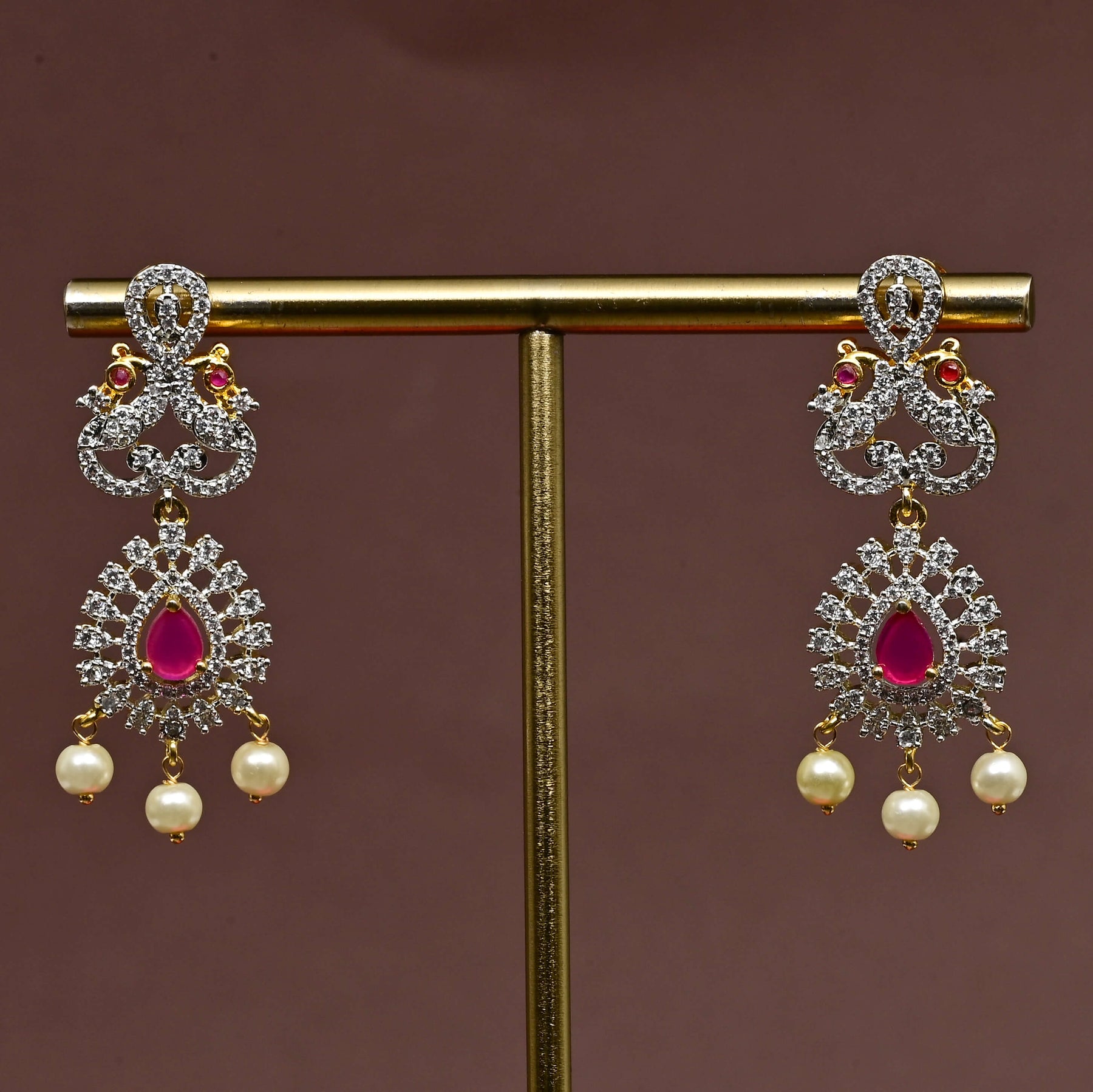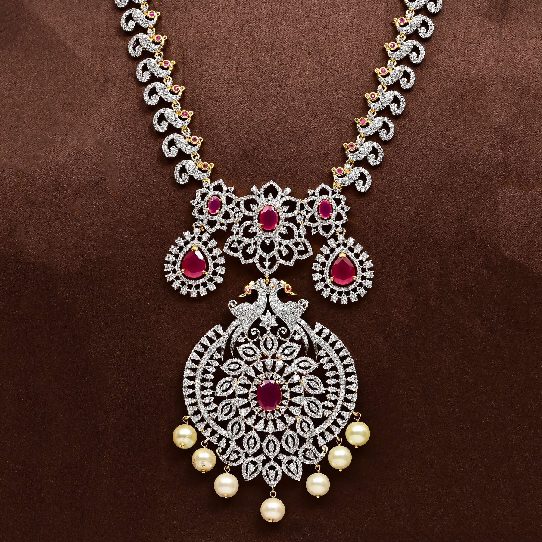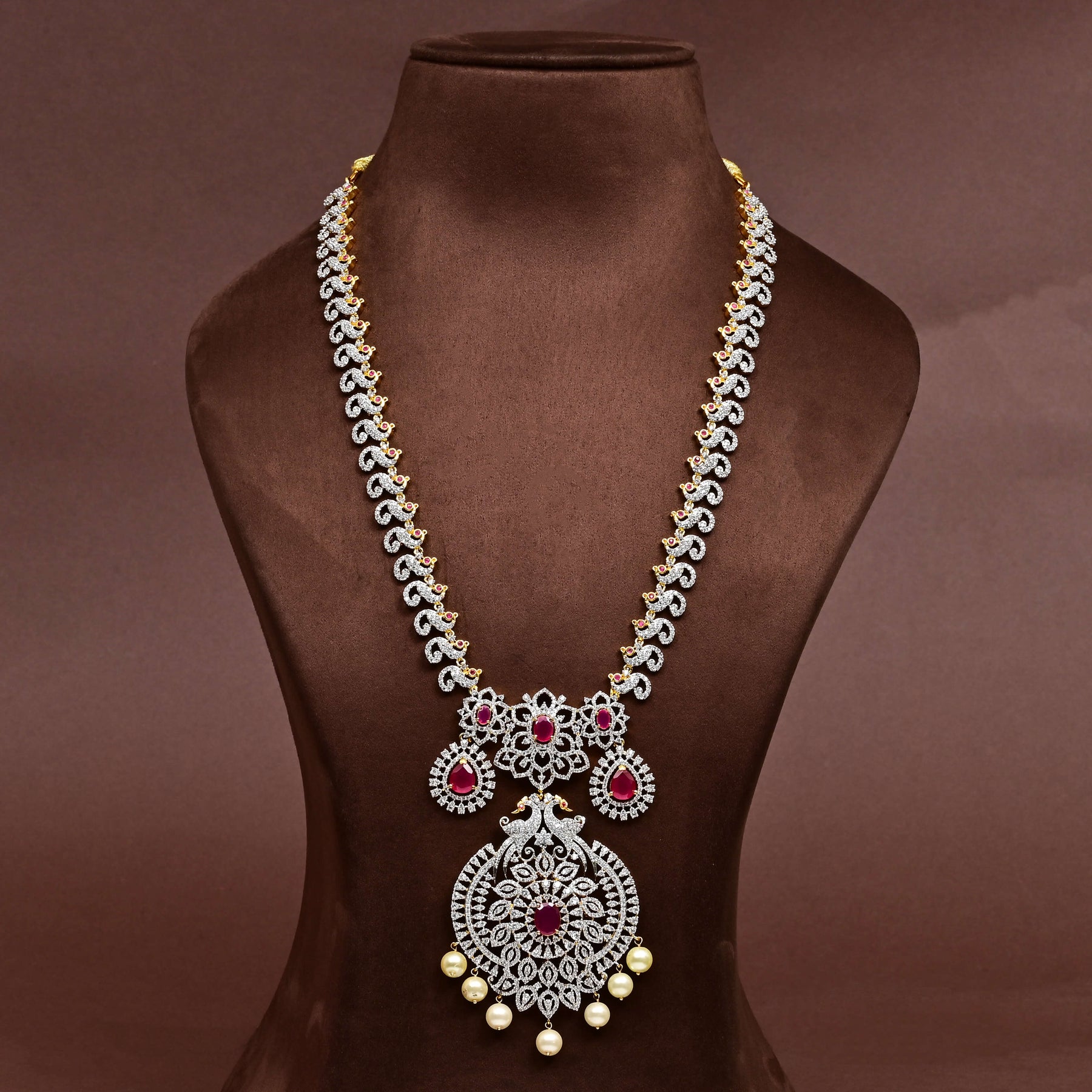 Elevate your collection with this exquisite CZ Necklace Set, meticulously handcrafted to deliver timeless elegance. Featuring brilliant diamond-finish cubic zirconia stones paired with rich semi-precious ruby accents, this piece captures the opulence of fine jewelry at an accessible price point. Each set showcases a distinctive one-of-a-kind design with royal aesthetics, making it an ideal choice for special occasions or everyday luxury. The expert craftsmanship ensures durability and lasting brilliance, while the sophisticated styling complements both traditional and contemporary wardrobes.