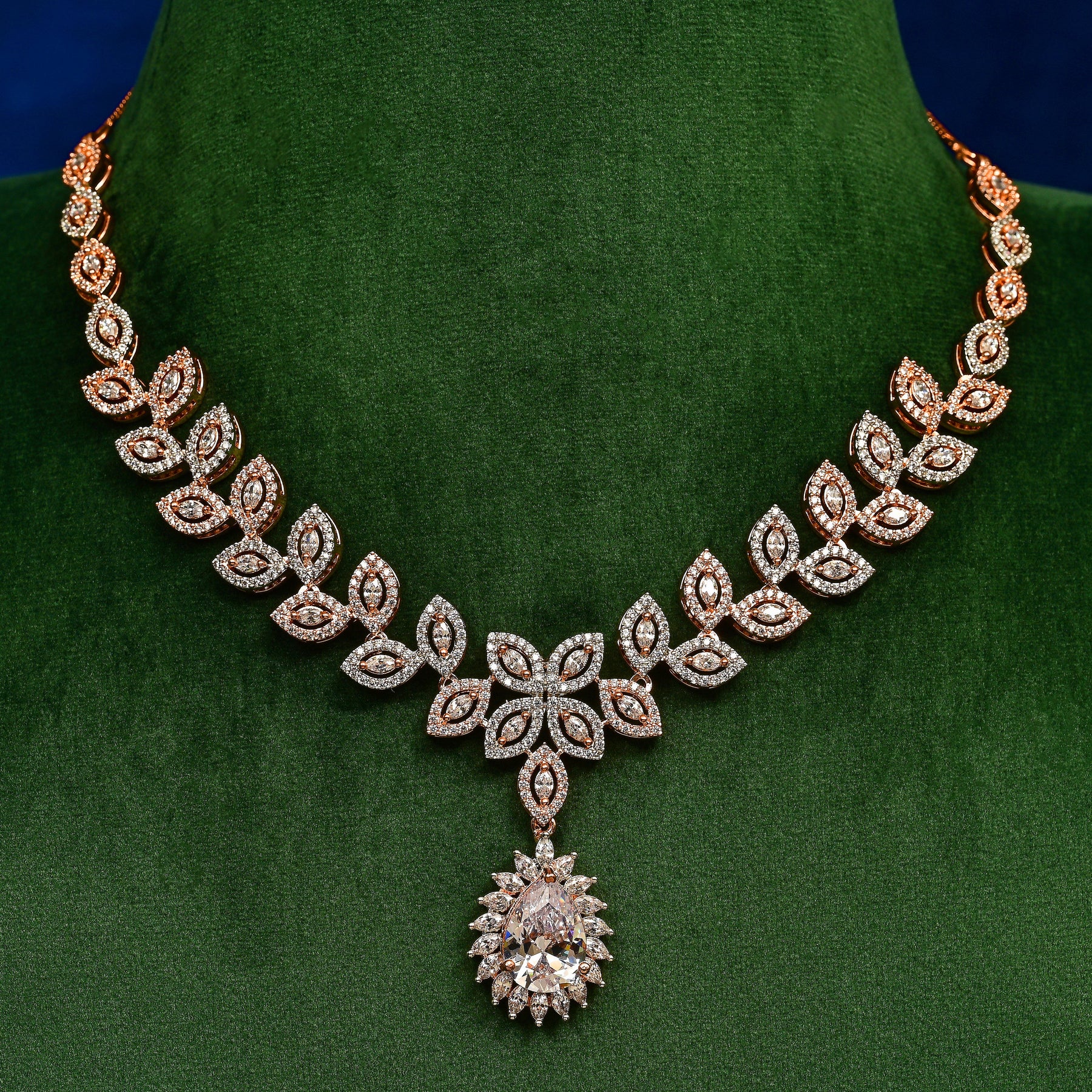 Meticulously hand-crafted, this exclusive CZ necklace set features genuine cubic zirconia stones that brilliantly mimic diamonds. The sophisticated rose gold finish enhances the luxurious appeal of this one-of-a-kind design. Each piece is expertly created to deliver exceptional sparkle and elegance for discerning jewelry connoisseurs.