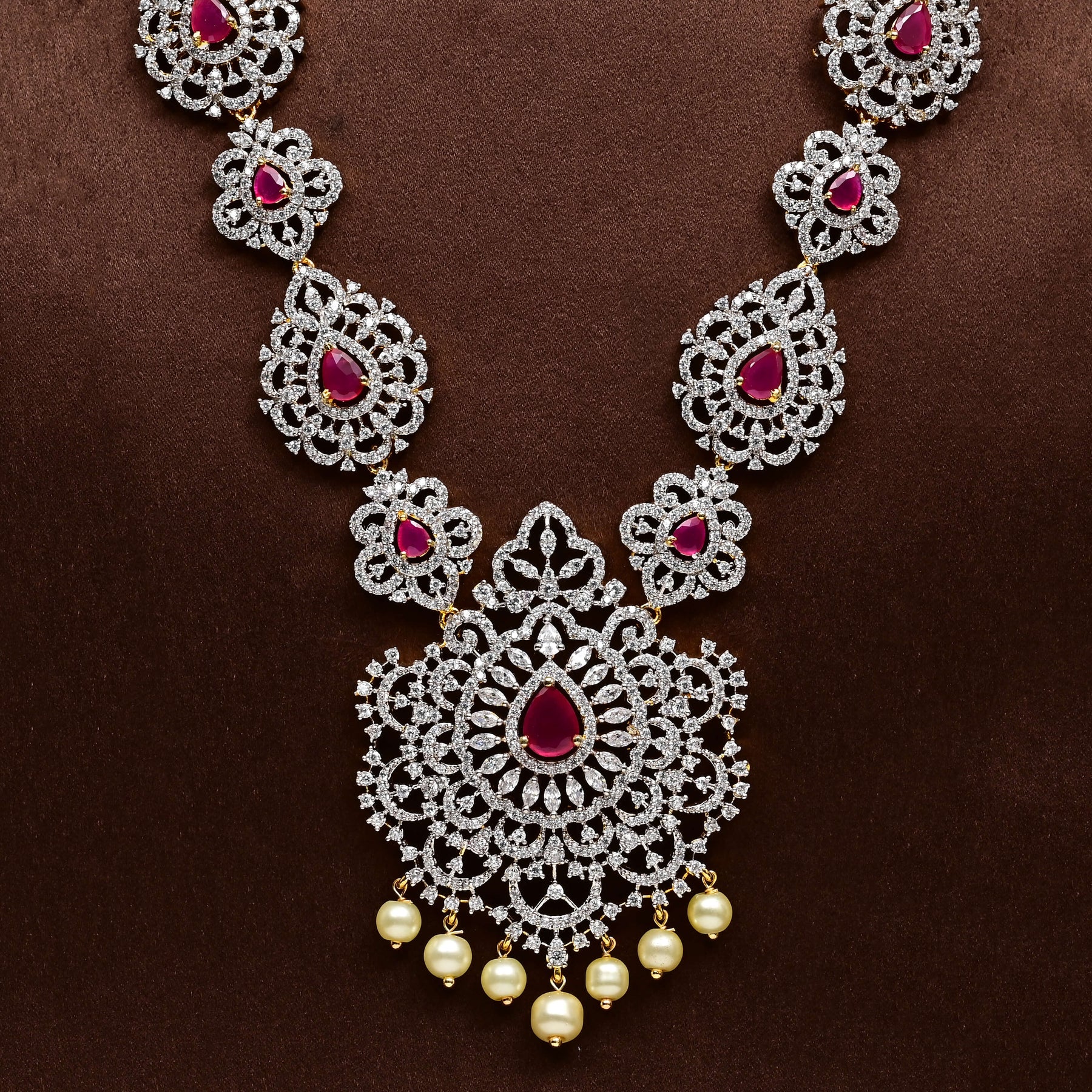 Elevate your collection with this exquisite CZ Necklace Set, meticulously handcrafted to deliver timeless elegance. Featuring brilliant diamond-finish cubic zirconia stones paired with rich semi-precious ruby accents, this piece captures the opulence of fine jewelry at an accessible price point. Each set showcases a distinctive one-of-a-kind design with royal aesthetics, making it an ideal choice for special occasions or everyday luxury. The expert craftsmanship ensures durability and lasting brilliance, while the sophisticated styling complements both traditional and contemporary wardrobes.