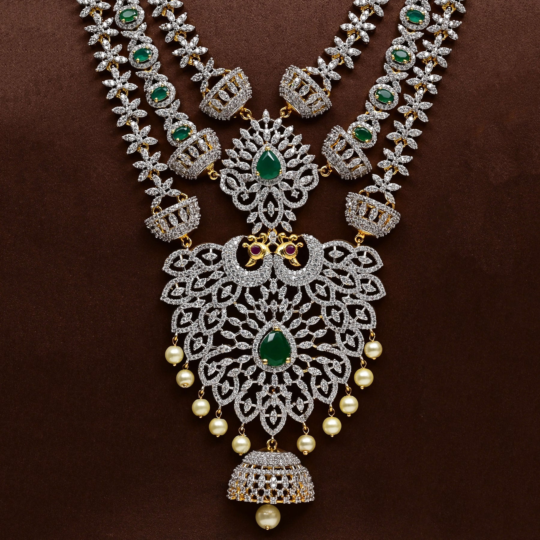 Elevate your collection with this exquisite CZ Necklace Set, meticulously handcrafted to deliver timeless elegance. Featuring authentic cubic zirconia stones in a brilliant diamond finish paired with semi-precious emerald accents, this piece captures the opulence of fine jewelry at an accessible price point. Each set showcases a distinctive one-of-a-kind design with royal aesthetics, making it an ideal choice for special occasions or everyday luxury. The expert craftsmanship ensures durability and lasting brilliance, while the emerald stones add a sophisticated pop of color. Perfect for those who appreciate quality artisanal work and distinctive style.