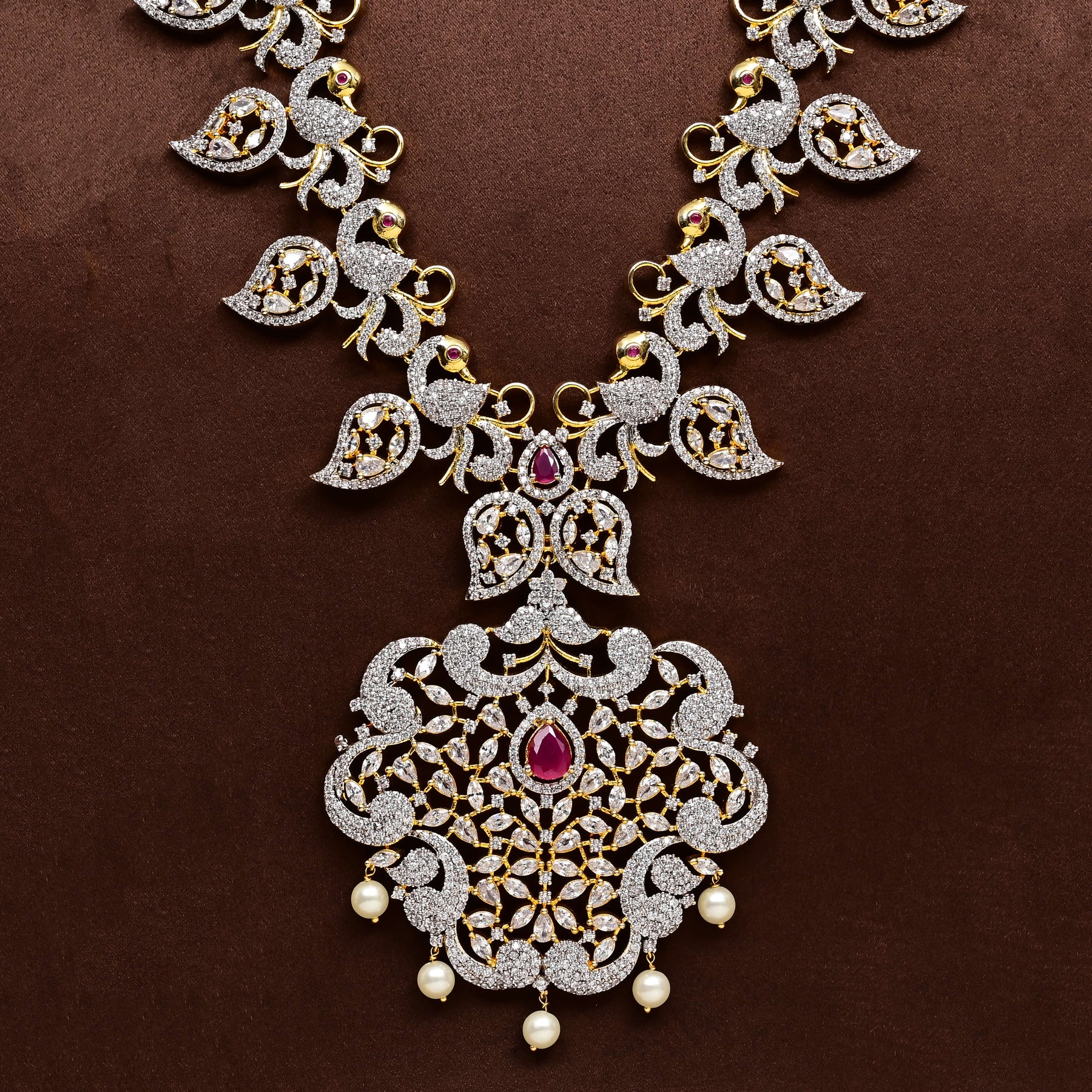 Elevate your collection with this exquisite CZ Necklace Set, meticulously handcrafted to deliver timeless elegance. Featuring brilliant diamond-finish cubic zirconia stones paired with rich semi-precious ruby accents, this piece captures the opulence of fine jewelry at an accessible price point. Each set showcases a distinctive one-of-a-kind design with royal aesthetics, making it an ideal choice for special occasions or everyday luxury. The expert craftsmanship ensures durability and lasting brilliance, while the sophisticated styling complements both traditional and contemporary wardrobes.