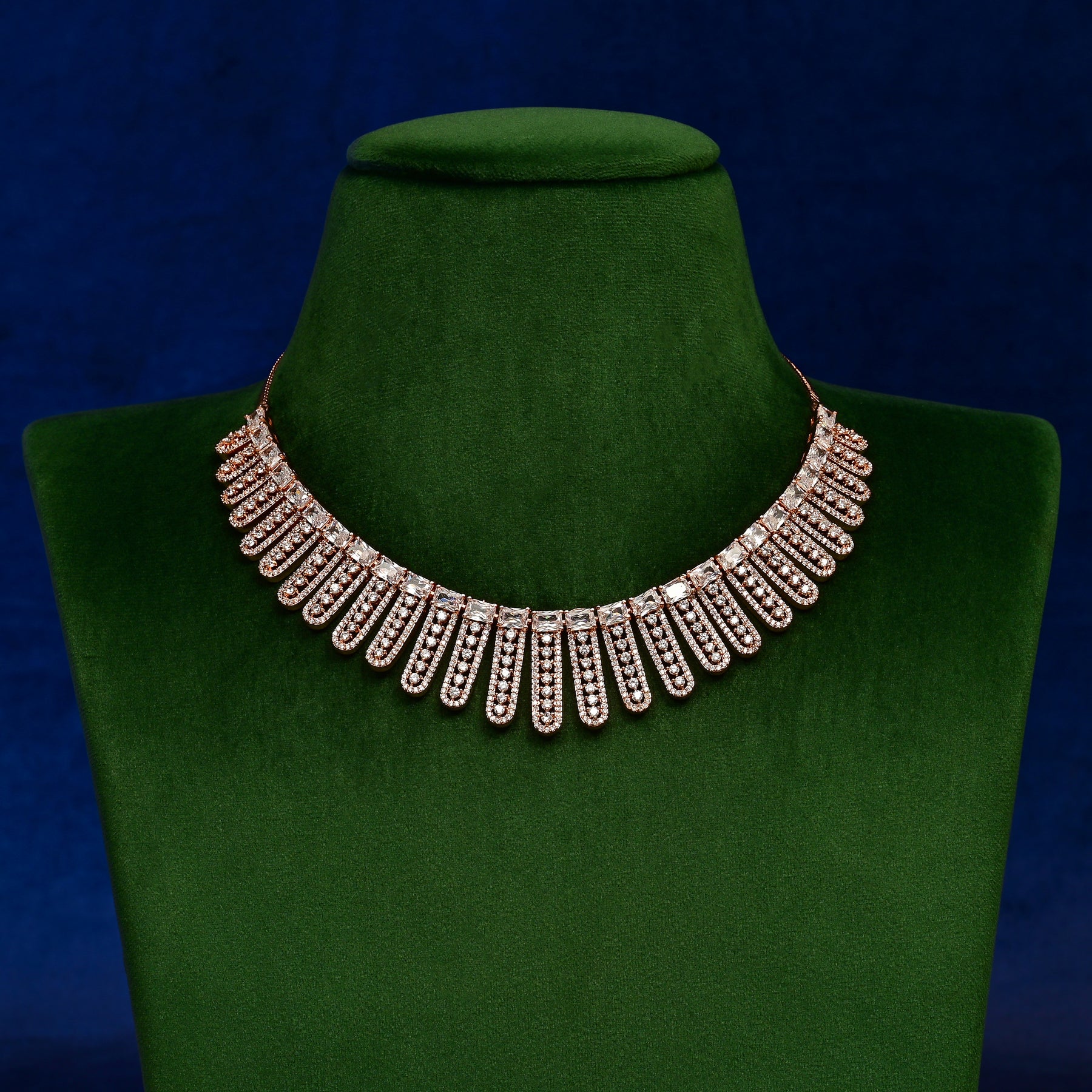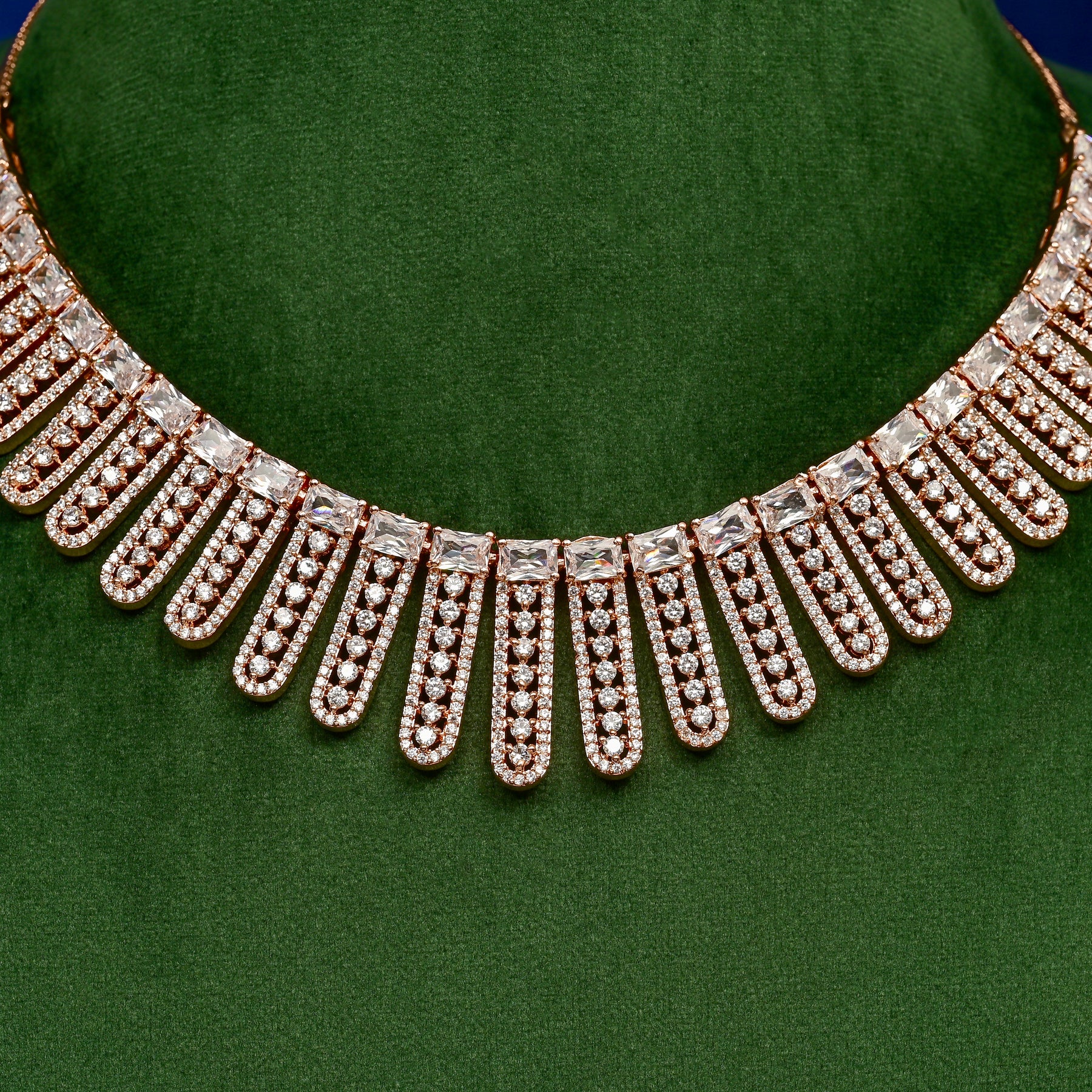 Exquisitely hand-crafted CZ necklace set featuring premium cubic zirconia stones that brilliantly mimic diamonds. Set in a sophisticated rose gold finish, this exclusive design offers unparalleled elegance. Each piece is meticulously created to ensure exceptional quality and distinctive character, making it a remarkable addition to fine jewelry collections.
