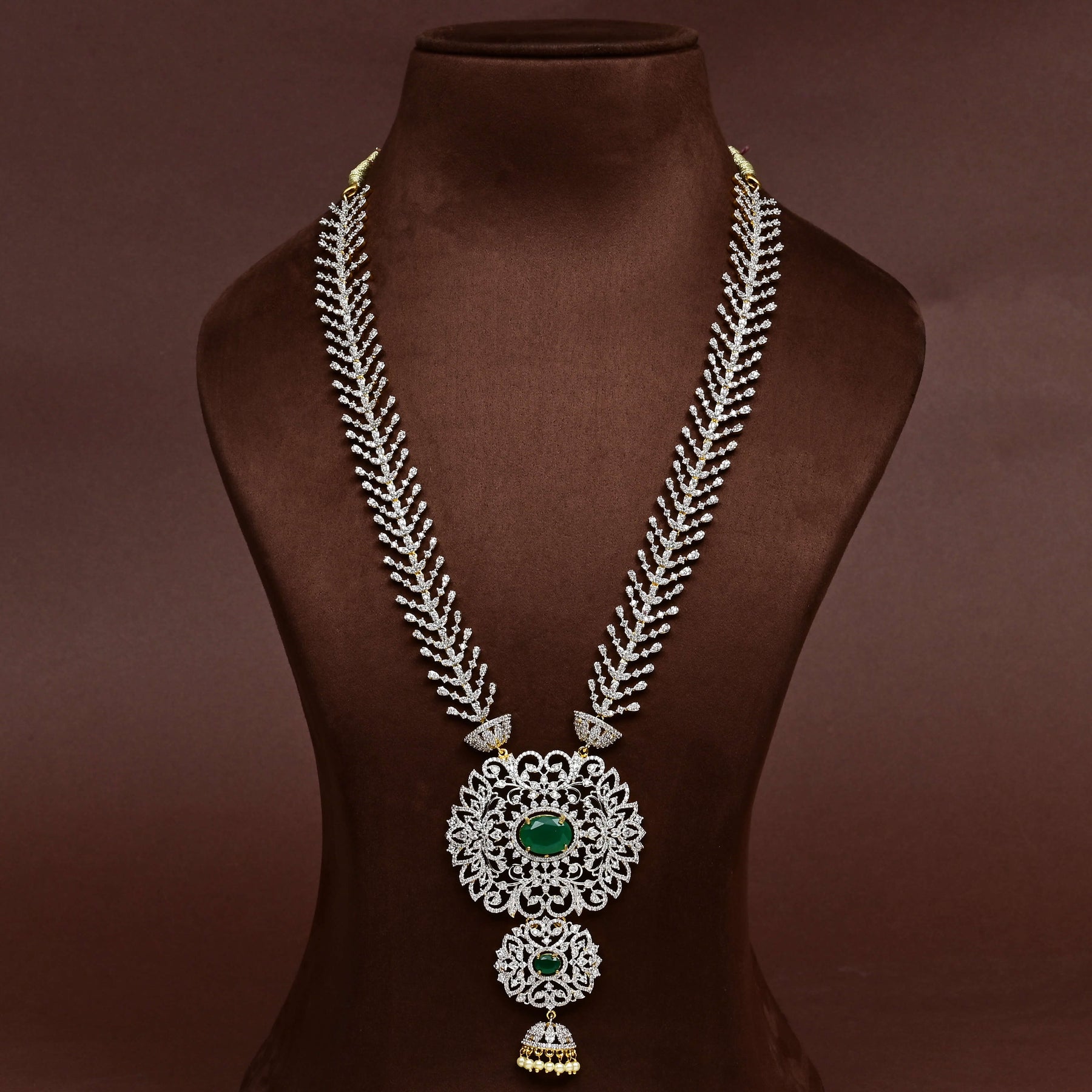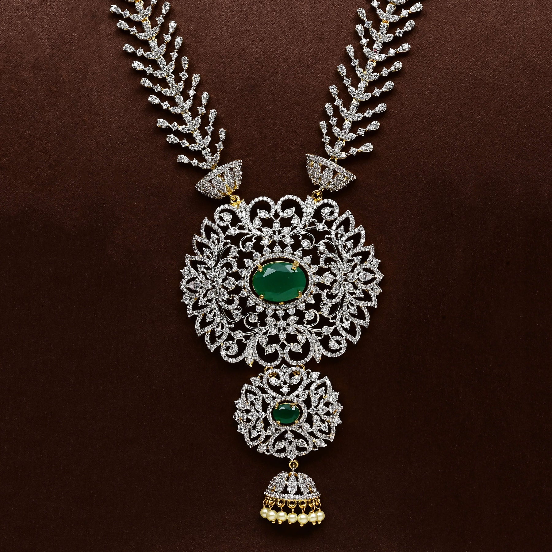This exquisite CZ Necklace Set boasts a diamond finish and is handcrafted with real cz stones and semi-precious emerald stones. Its one-of-a-kind design exudes a royal look, making it a must-have for any jewelry collection. Elevate any outfit with this stunning and unique necklace set.