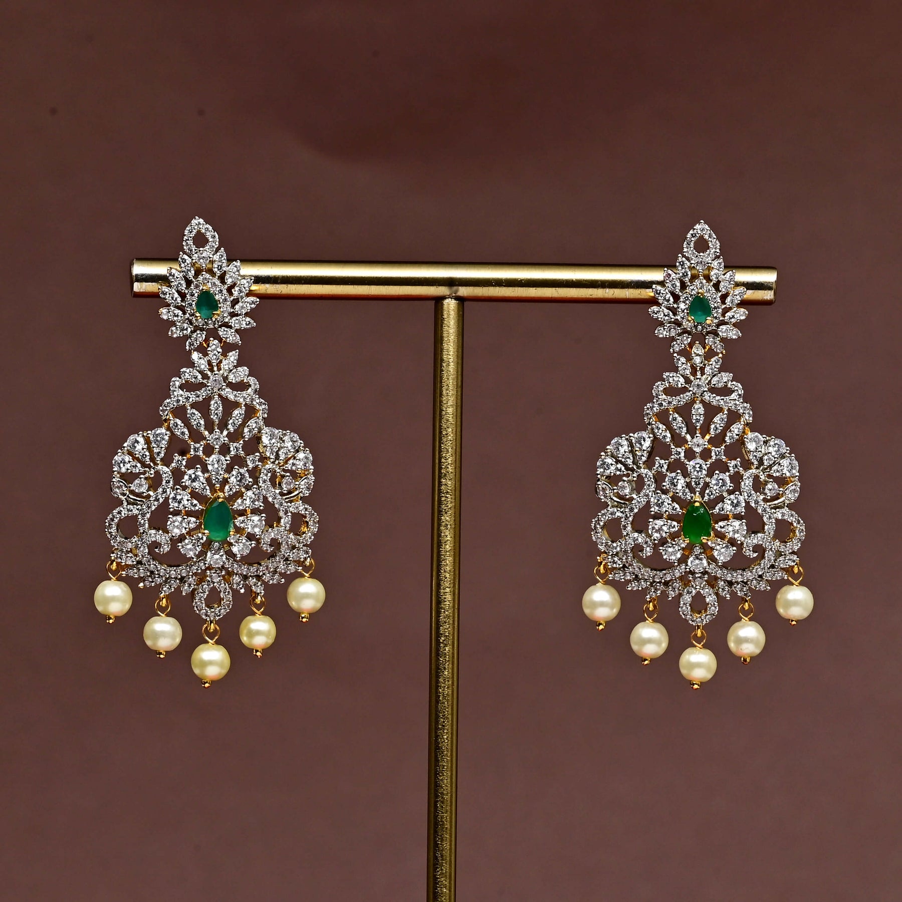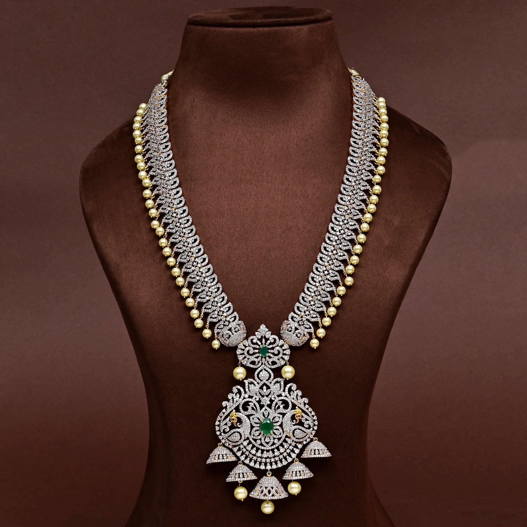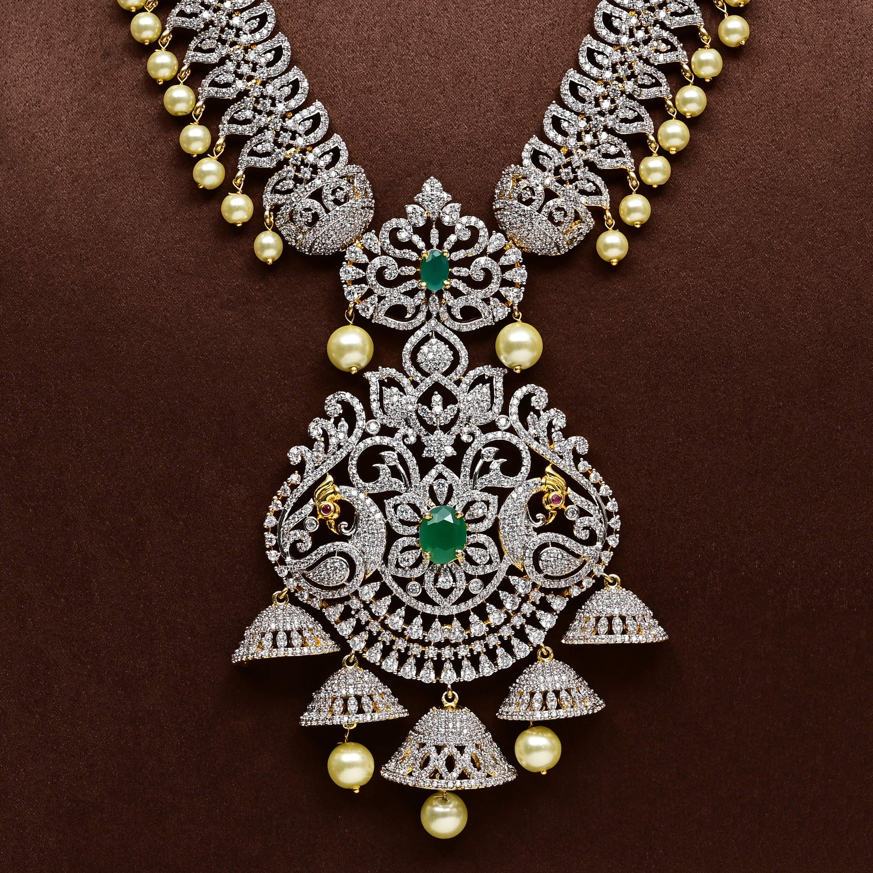 This CZ Necklace Set is crafted with expert care to give it a royal look. Featuring real CZ stones and semi-precious emerald stones, this one-of-a-kind design is sure to make a statement. The diamond finish adds to its unique and luxurious appeal. Elevate any outfit with this handcrafted necklace set.