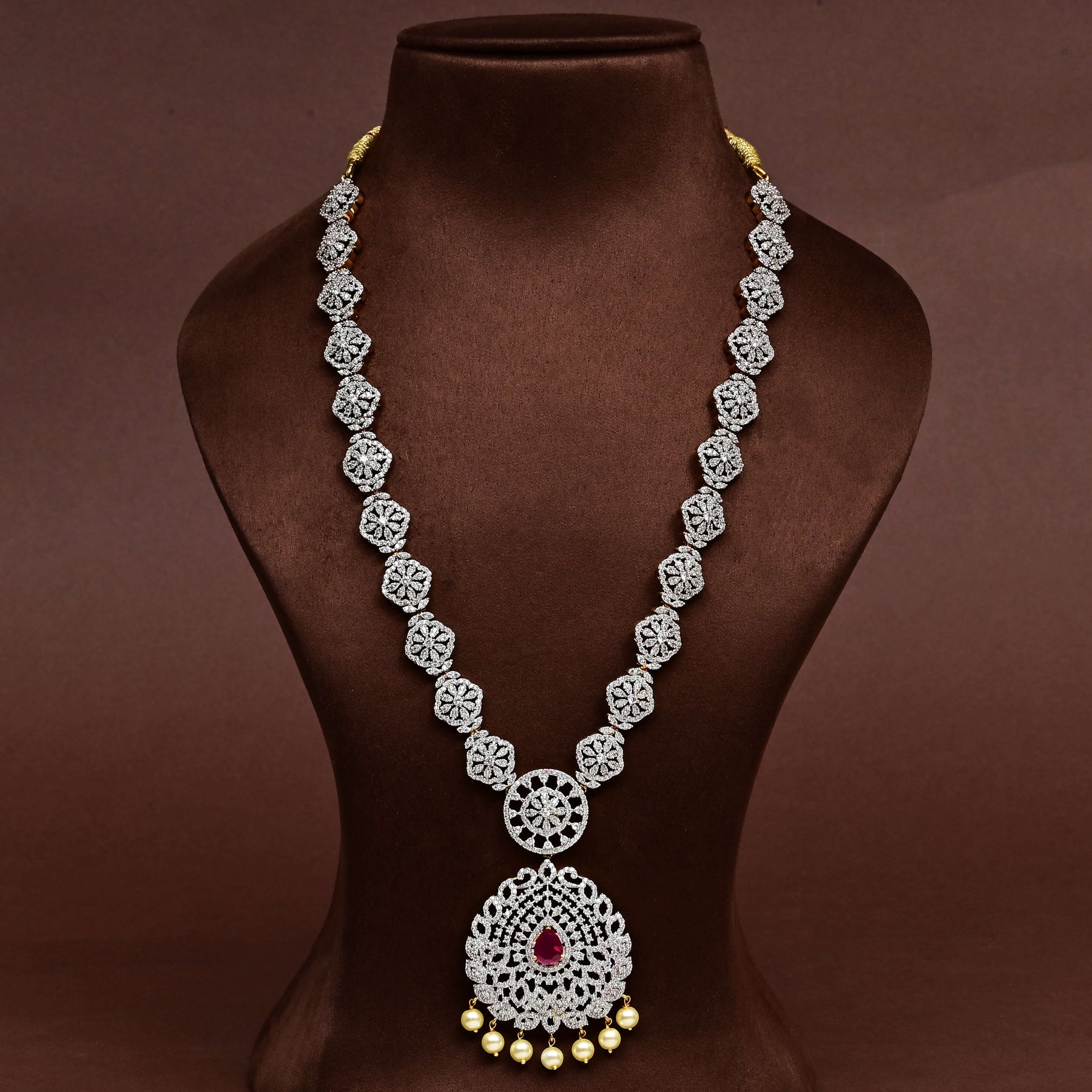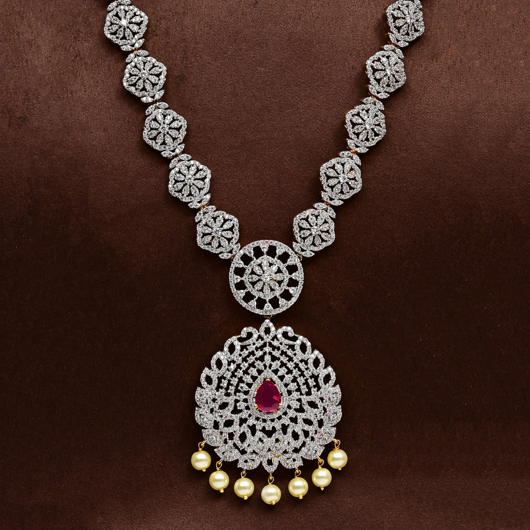 Elevate your style with our CZ Necklace Set. Each piece is carefully handcrafted and features a diamond finish with real CZ and semi-precious ruby stones. With its one-of-a-kind design and royal look, this set is guaranteed to add a touch of elegance to any outfit. Experience luxury at an affordable price.