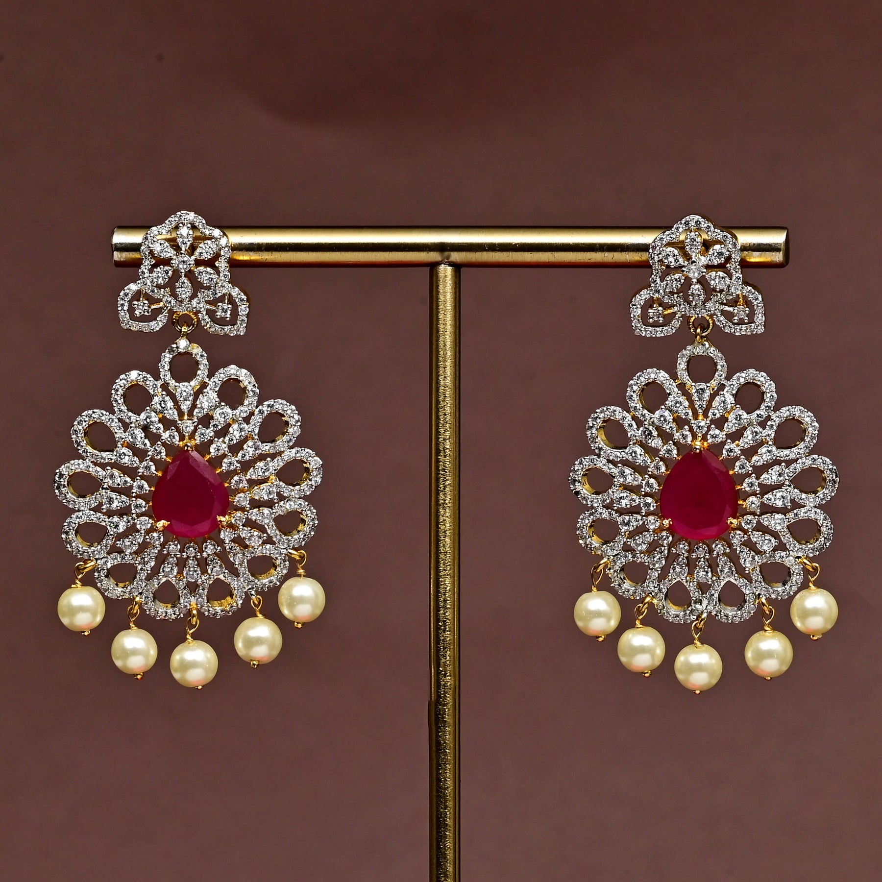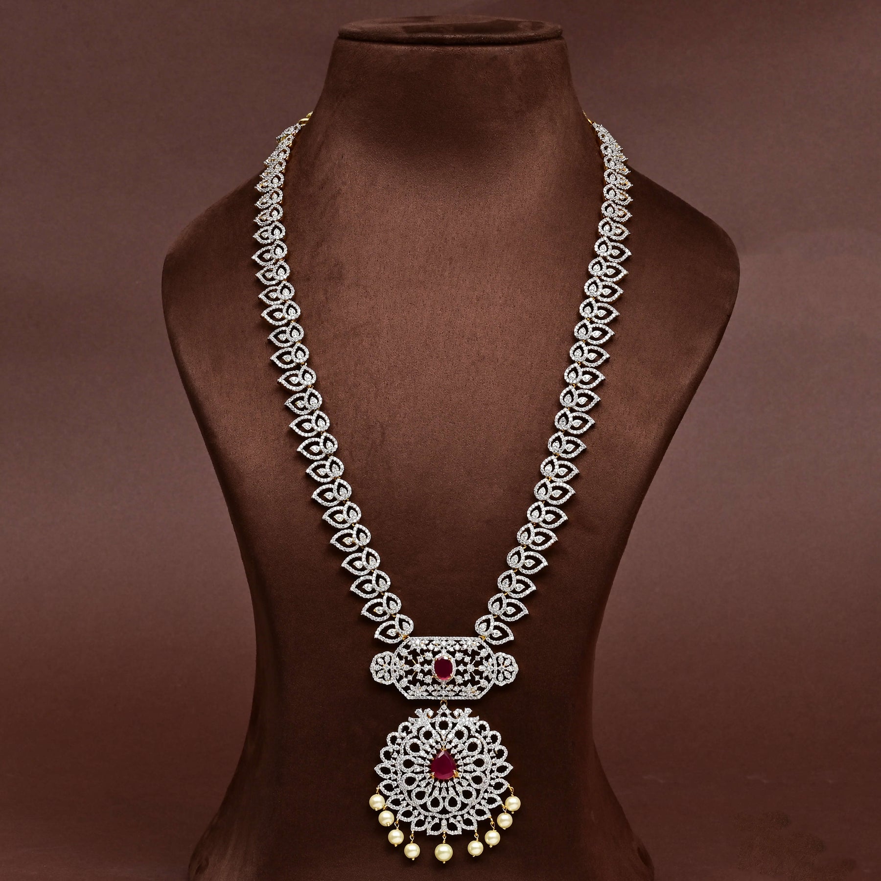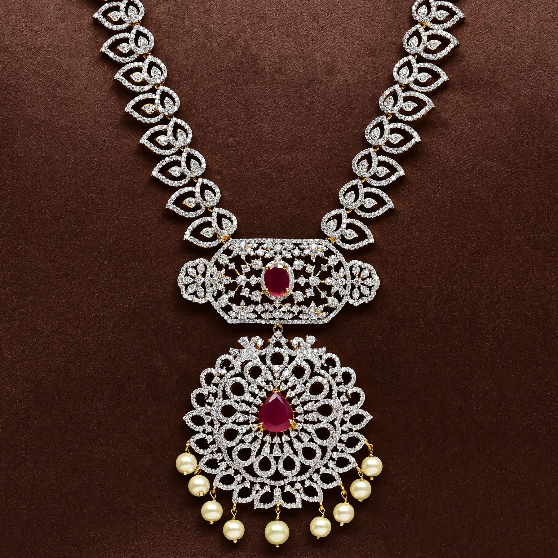 Enhance your jewelry collection with our CZ Necklace Set. Handcrafted with real CZ and semi-precious ruby stones, this set features a diamond finish and a one-of-a-kind design that gives it a royal look. Add a touch of elegance and sophistication to any outfit with this exquisite accessory.