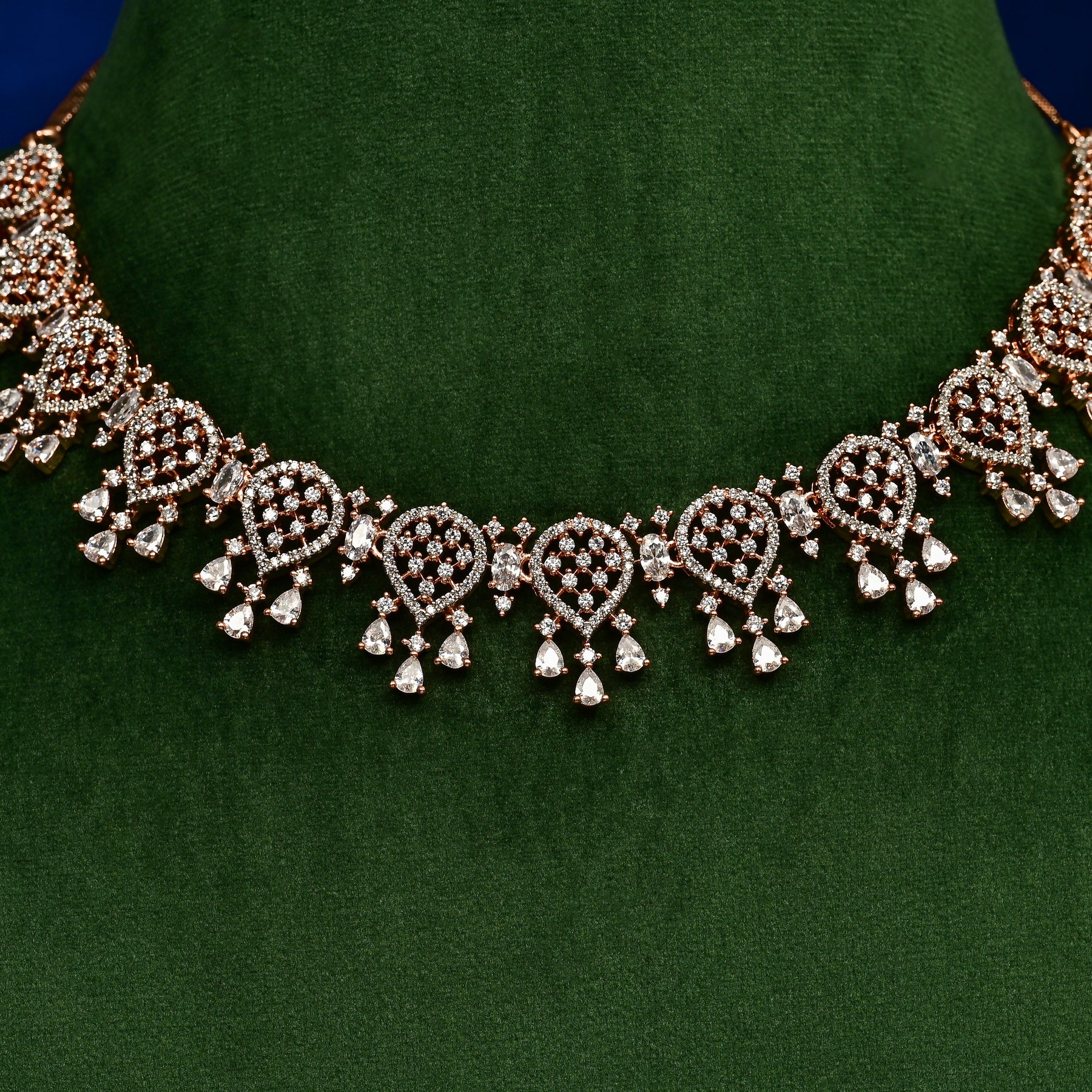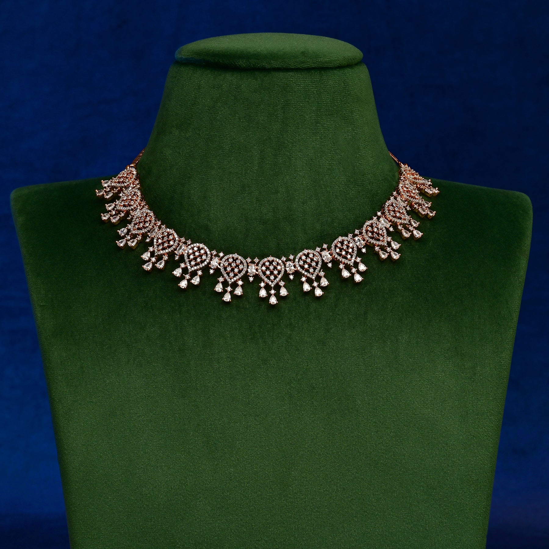 Exquisitely hand-crafted CZ necklace set featuring premium cubic zirconia stones that brilliantly mimic diamonds. Set in an elegant rose gold finish, this exclusive design offers sophisticated luxury. Each piece is meticulously created to ensure exceptional quality and unparalleled brilliance for discerning jewelry connoisseurs.