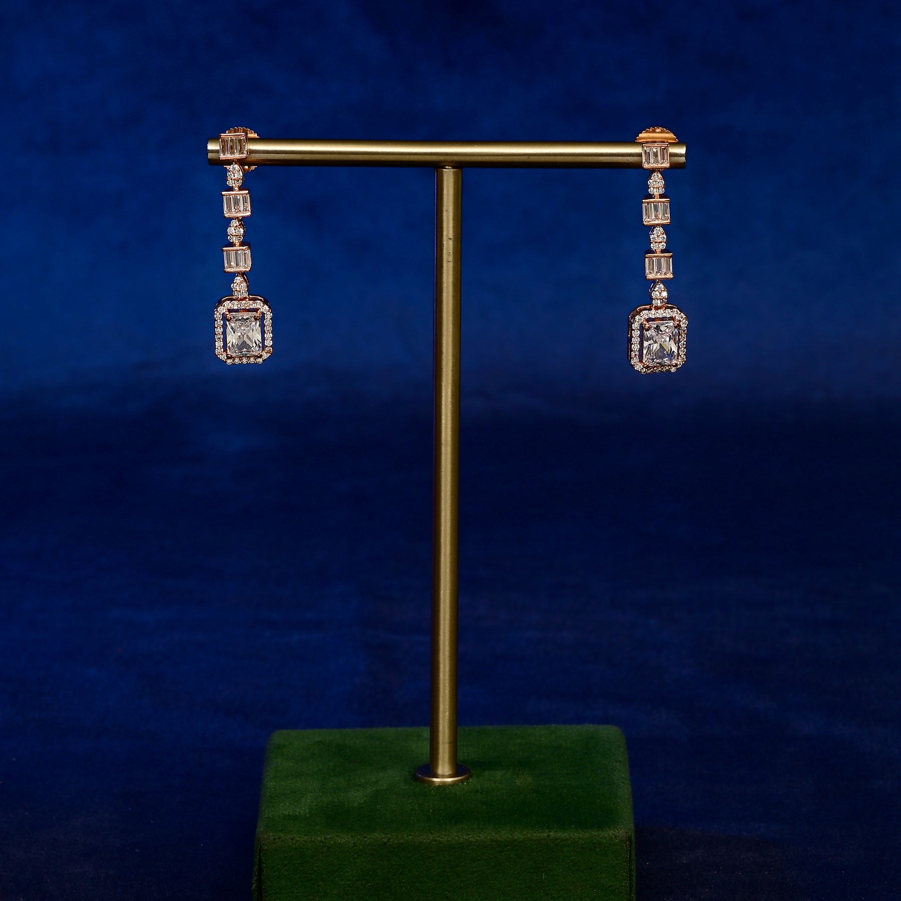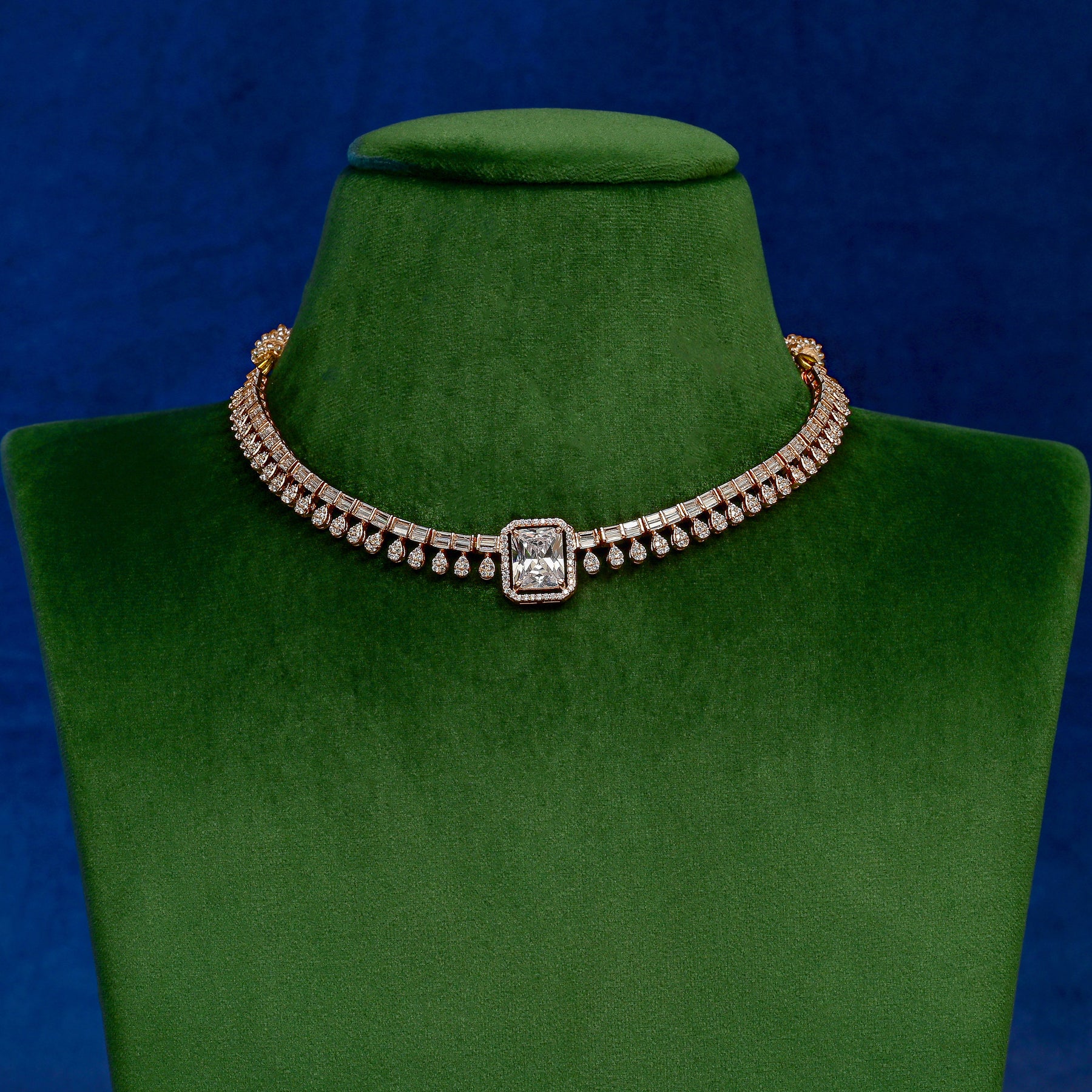 Exquisitely hand-crafted CZ necklace set featuring premium cubic zirconia stones that brilliantly mimic diamonds. This exclusive design showcases a sophisticated rose gold finish, creating a luxurious statement piece. Each element is meticulously crafted to ensure exceptional quality and unparalleled elegance in this one-of-a-kind creation.