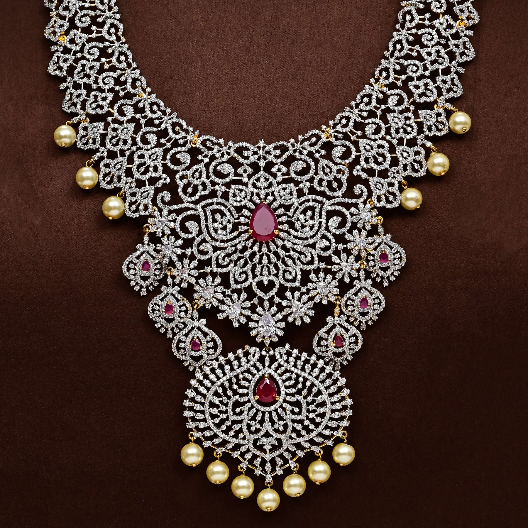 Elevate your collection with this exquisite CZ Necklace Set, meticulously handcrafted to deliver timeless elegance. Featuring authentic cubic zirconia stones in a brilliant diamond finish paired with semi-precious ruby accents, this piece captures the opulence of fine jewelry at an accessible price point. Each set showcases a distinctive one-of-a-kind design with regal proportions that command attention. The expert craftsmanship ensures superior quality and durability, making it an ideal choice for special occasions or everyday luxury. Experience the sophistication of a statement piece that combines contemporary artistry with traditional jewelry-making techniques.