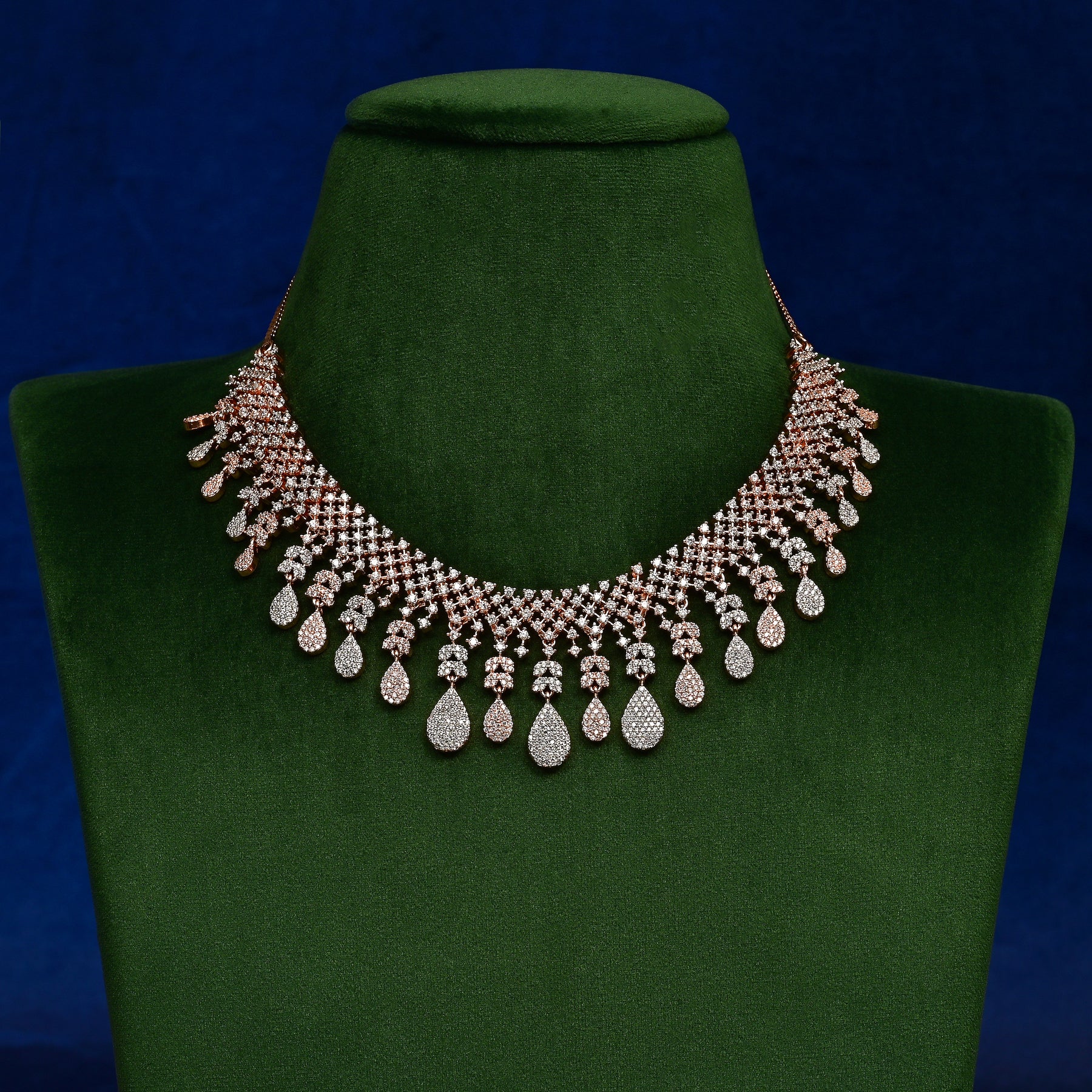 This exquisite CZ Necklace Set features genuine cubic zirconia stones meticulously hand-crafted to achieve a diamond-like brilliance. Set in an elegant rose gold finish, this exclusive design represents exceptional artisanship. The unique composition and attention to detail make this set a distinguished addition to any fine jewelry collection.