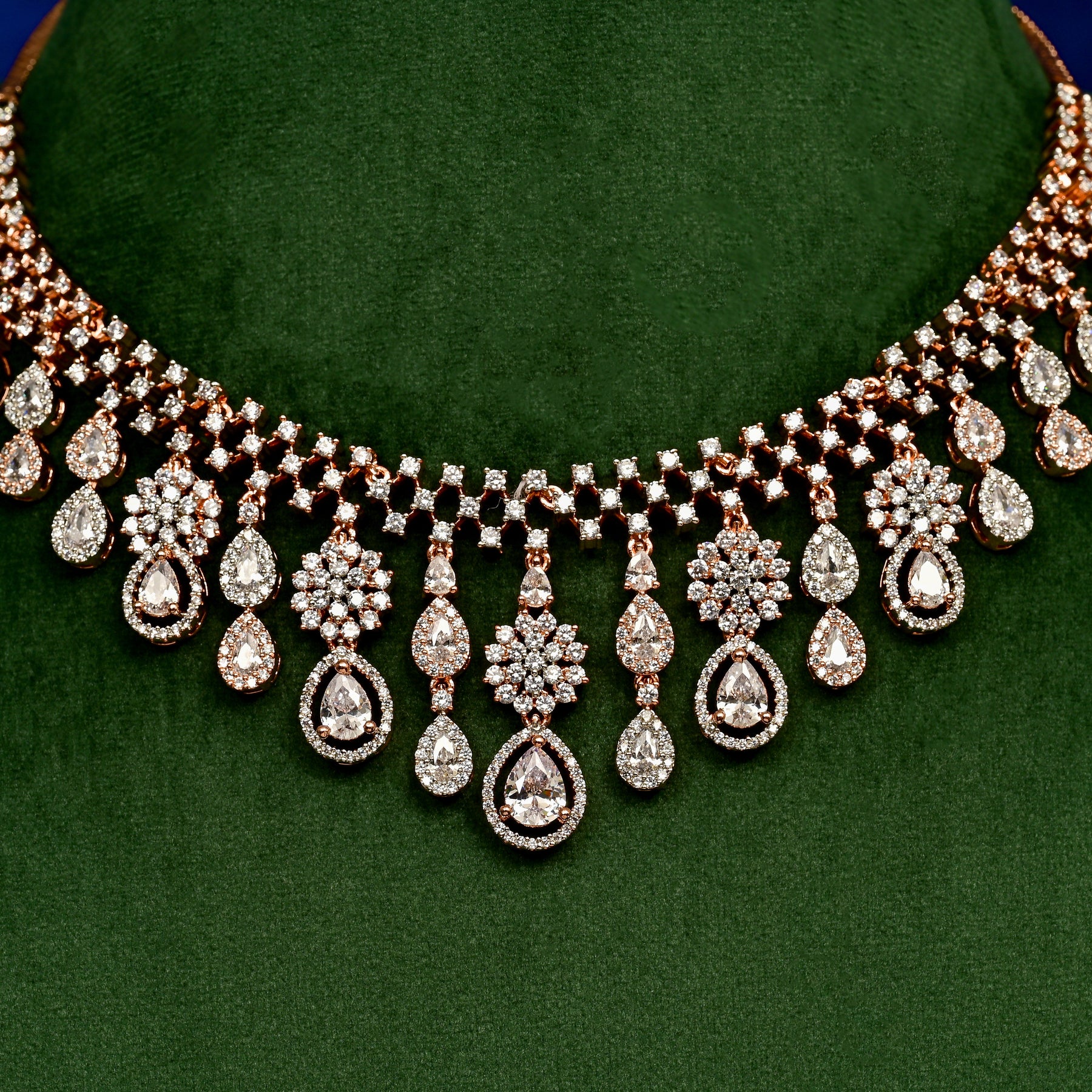 Exquisitely hand-crafted CZ necklace set featuring premium cubic zirconia stones that brilliantly mimic diamonds. Set in a sophisticated rose gold finish, this exclusive design offers unparalleled elegance. Each piece is meticulously created to ensure exceptional quality and distinctive character, making it a truly remarkable addition to any fine jewelry collection.