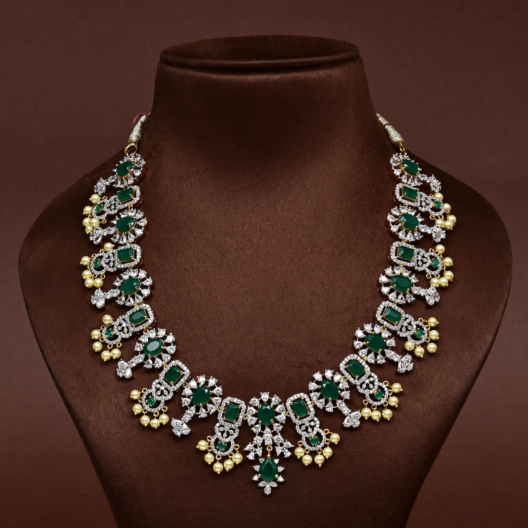 Elevate your jewellery collection with this exquisite CZ Necklace Set, meticulously handcrafted to showcase timeless elegance. Featuring authentic cubic zirconia stones in a brilliant diamond finish paired with genuine semi-precious emeralds, this set delivers sophisticated sparkle and rich colour. Each piece is individually designed and crafted, ensuring you own a truly distinctive accessory. The expert combination of premium materials and artisanal workmanship creates a refined aesthetic perfect for both special occasions and elevated everyday wear. A statement piece that reflects discerning taste and exceptional craftsmanship.