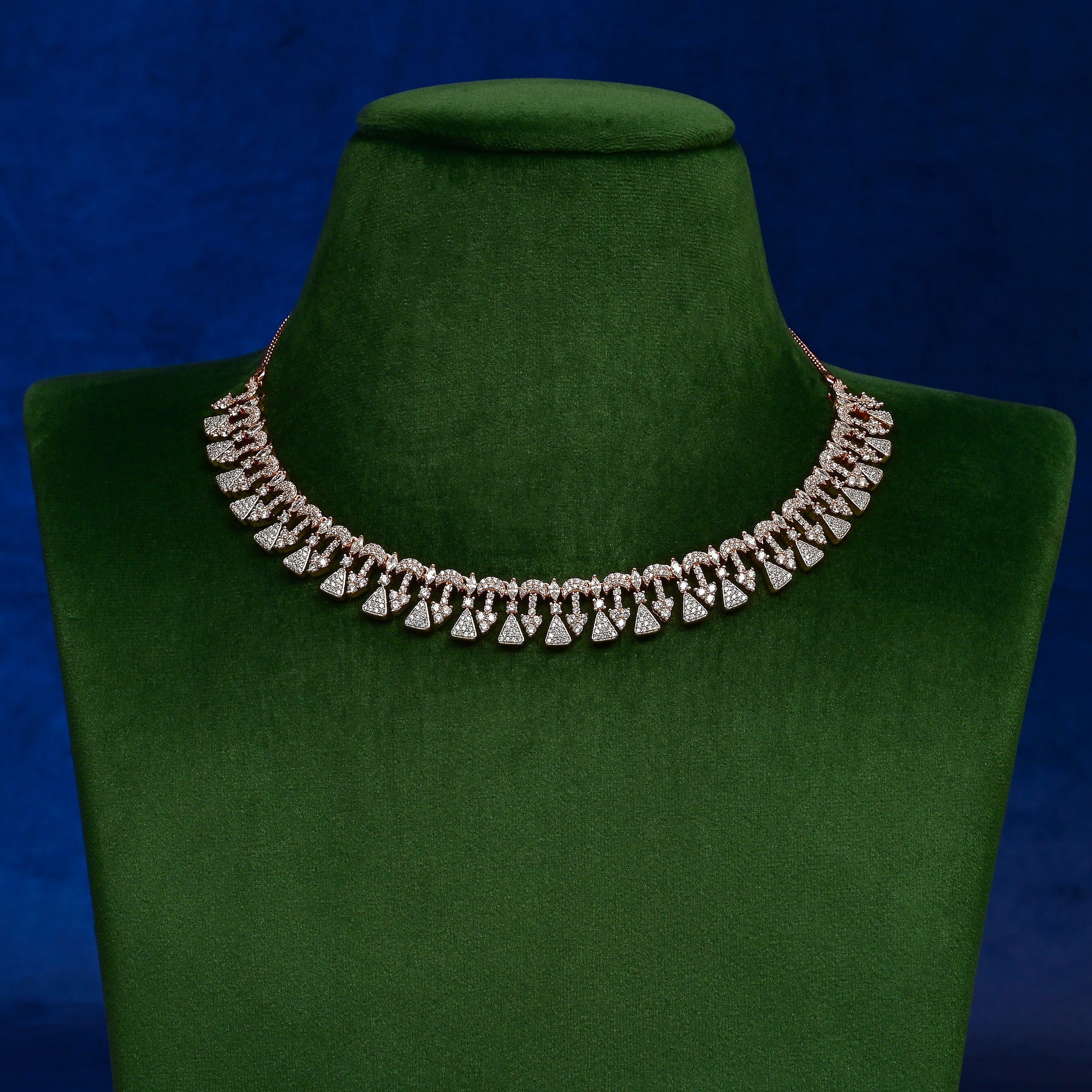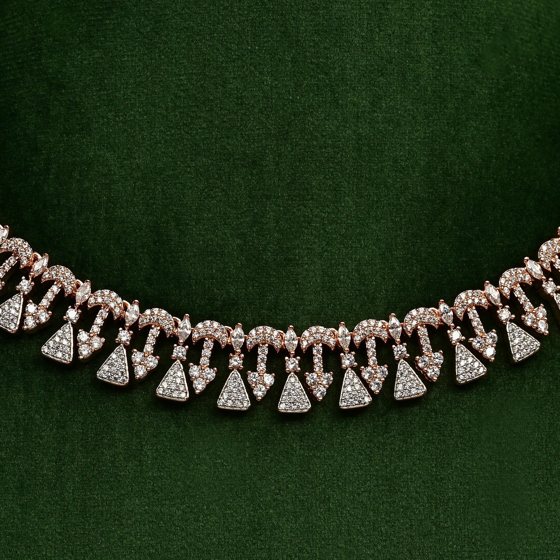 This exquisite CZ Necklace Set features genuine cubic zirconia stones meticulously hand-crafted to achieve a diamond-like brilliance. Set in an elegant rose gold finish, this exclusive design represents exceptional craftsmanship and attention to detail. The unique, one-of-a-kind arrangement makes this set a distinguished addition to any fine jewelry collection.