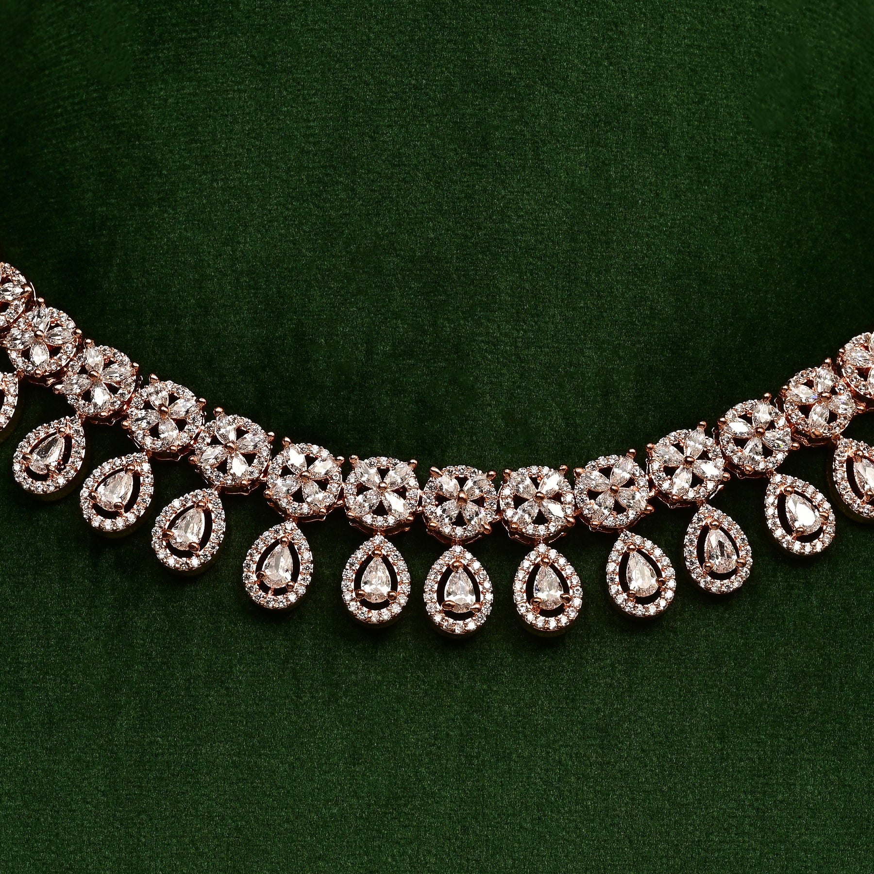 Exquisitely hand-crafted CZ necklace set featuring premium cubic zirconia stones that brilliantly mimic diamonds. Set in a sophisticated rose gold finish, this exclusive design offers unparalleled elegance. Each piece is meticulously created to ensure exceptional quality and distinctive character, making it a truly one-of-a-kind addition to any fine jewelry collection.