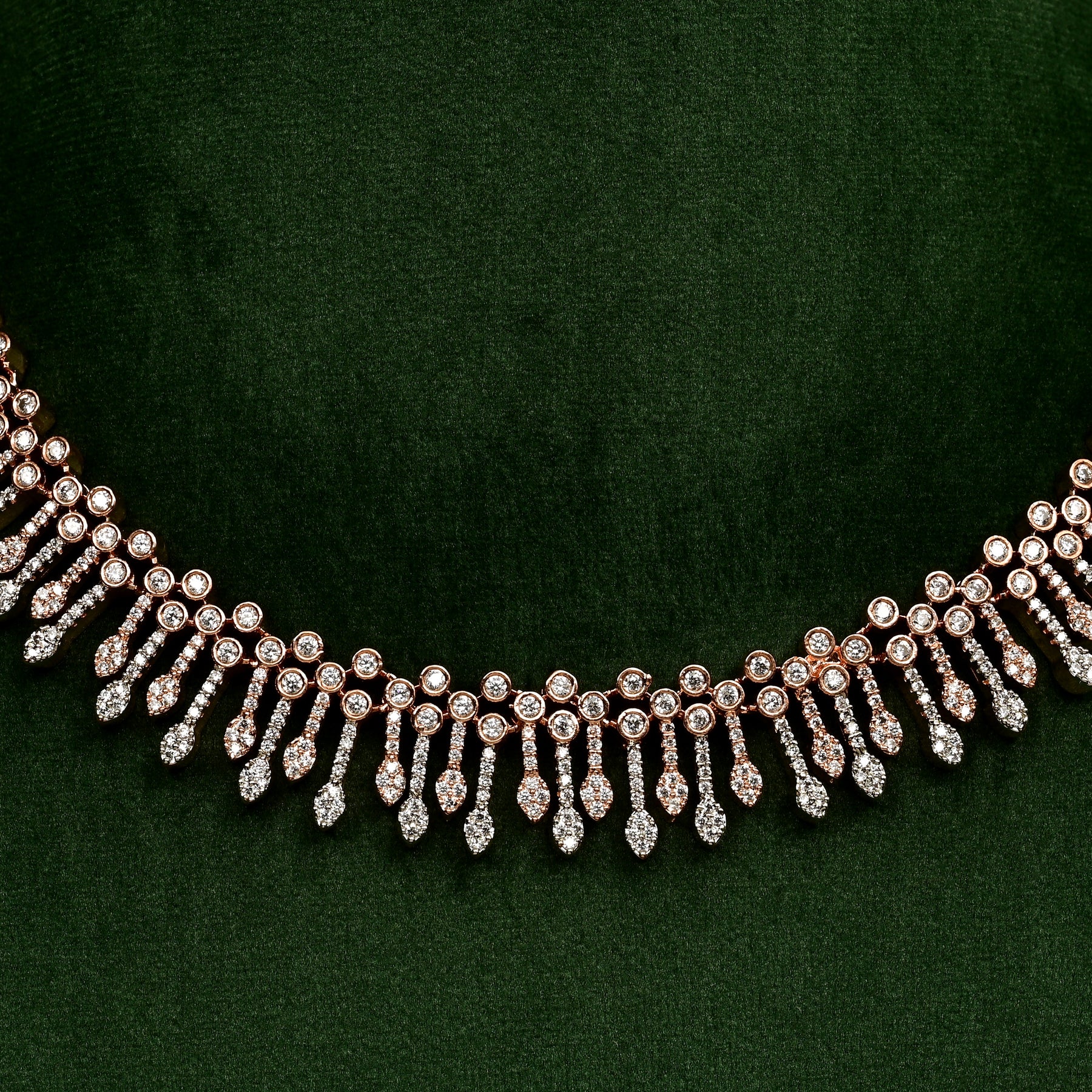 Exquisitely hand-crafted CZ necklace set featuring premium cubic zirconia stones that brilliantly mimic diamonds. Set in a sophisticated rose gold finish, this exclusive design offers unparalleled elegance. Each piece is meticulously created to ensure exceptional quality and distinctive character, making it a truly remarkable addition to fine jewelry collections.