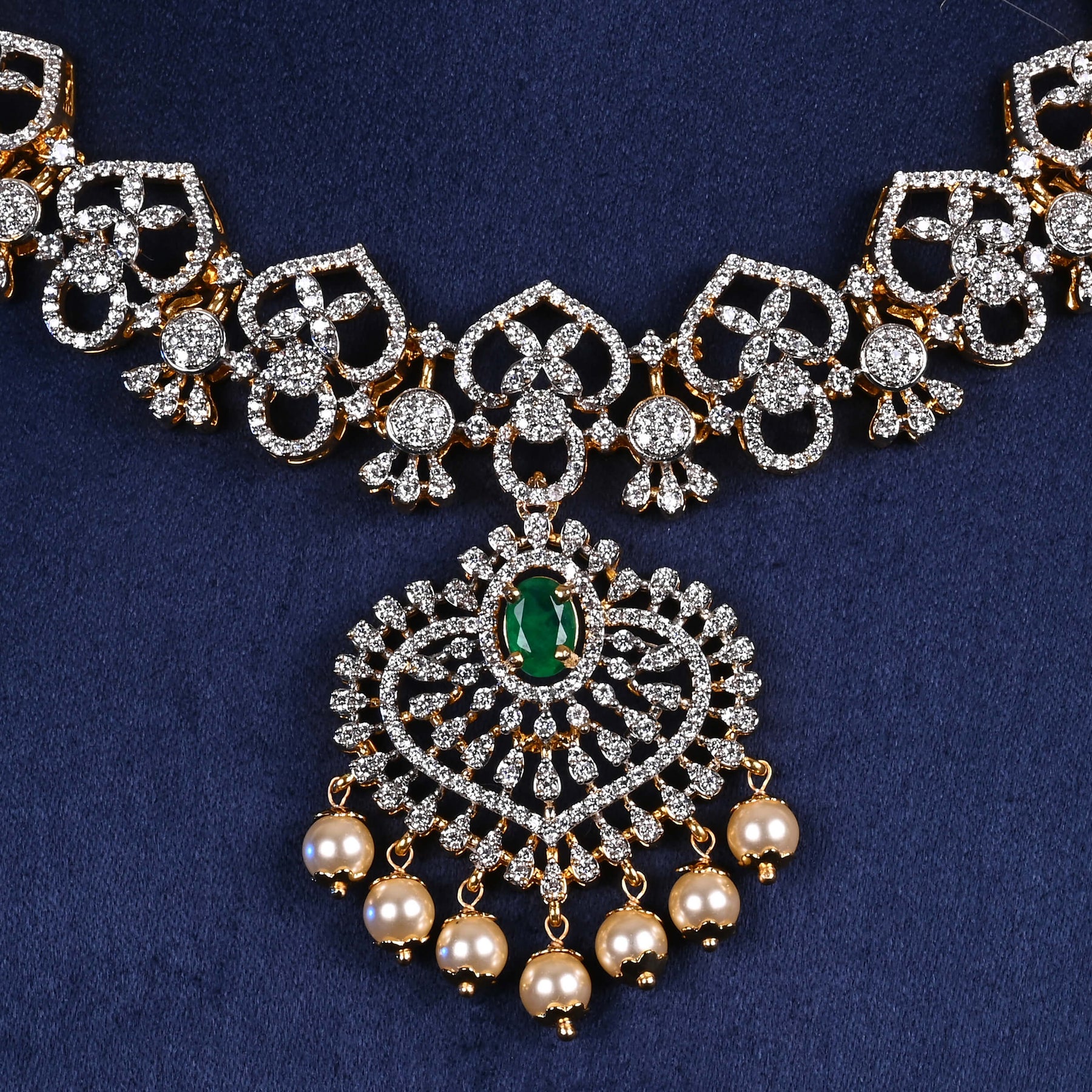 This 92.5 sterling silver necklace features genuine semi-precious emerald stones complemented by high-quality cubic zirconia accents. Each piece is meticulously handcrafted to achieve a diamond-like brilliance. The exquisite design showcases expert artisanship, creating a sophisticated statement piece that combines traditional craftsmanship with contemporary elegance.