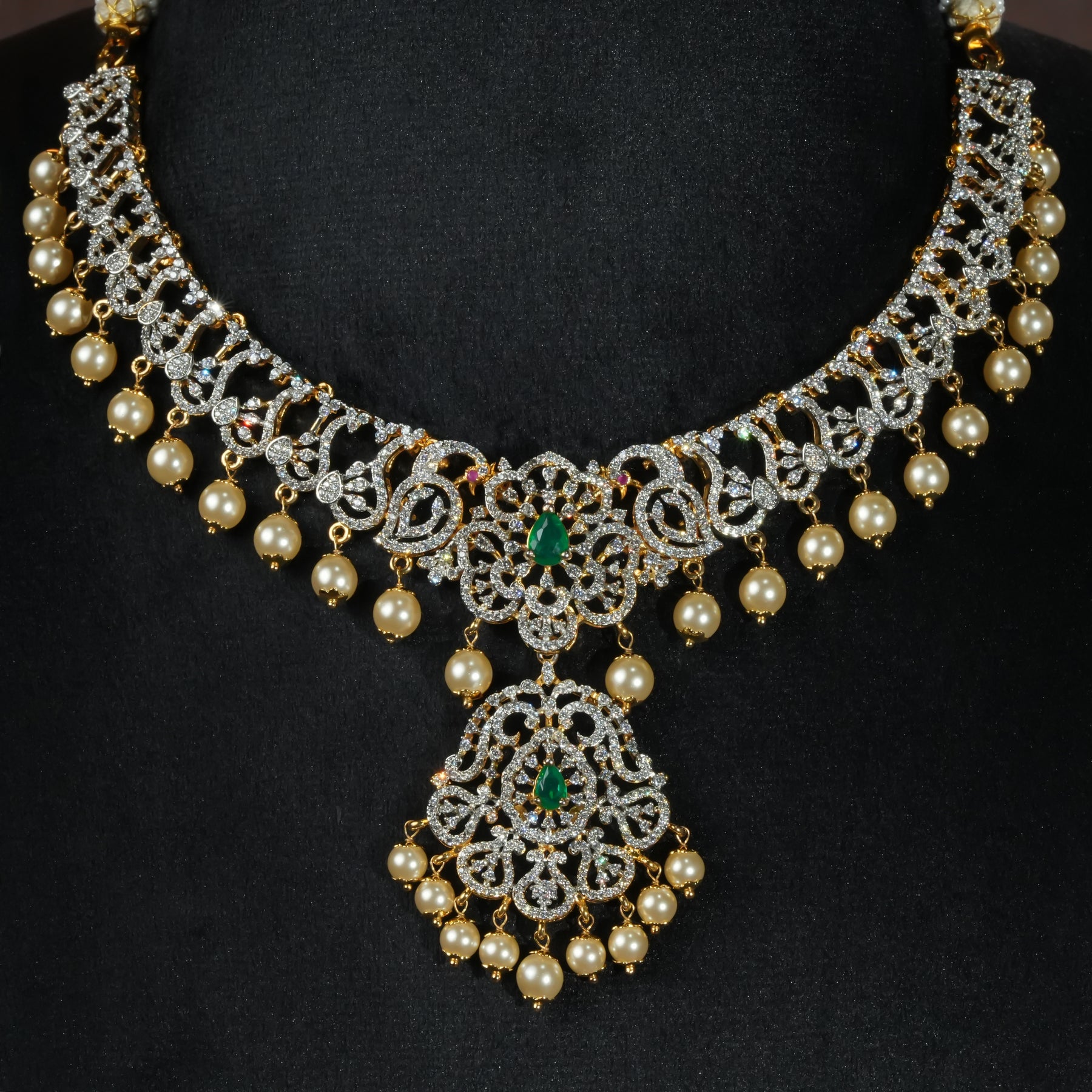 Elevate your elegance with this exquisite handcrafted silver necklace, meticulously designed to make a statement. Crafted from premium 925 sterling silver, this one-of-a-kind piece features brilliant cubic zirconia stones paired with genuine semi-precious emeralds, creating a stunning interplay of sparkle and rich green hues. Each necklace is individually handcrafted, ensuring no two pieces are identical. The royal and classy aesthetic makes it perfect for special occasions, celebrations, or adding sophistication to your everyday collection. The combination of lustrous CZ stones and authentic emeralds delivers timeless beauty with a contemporary edge. A treasure for those who appreciate fine craftsmanship and distinctive jewelry that tells a story.